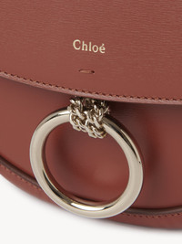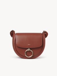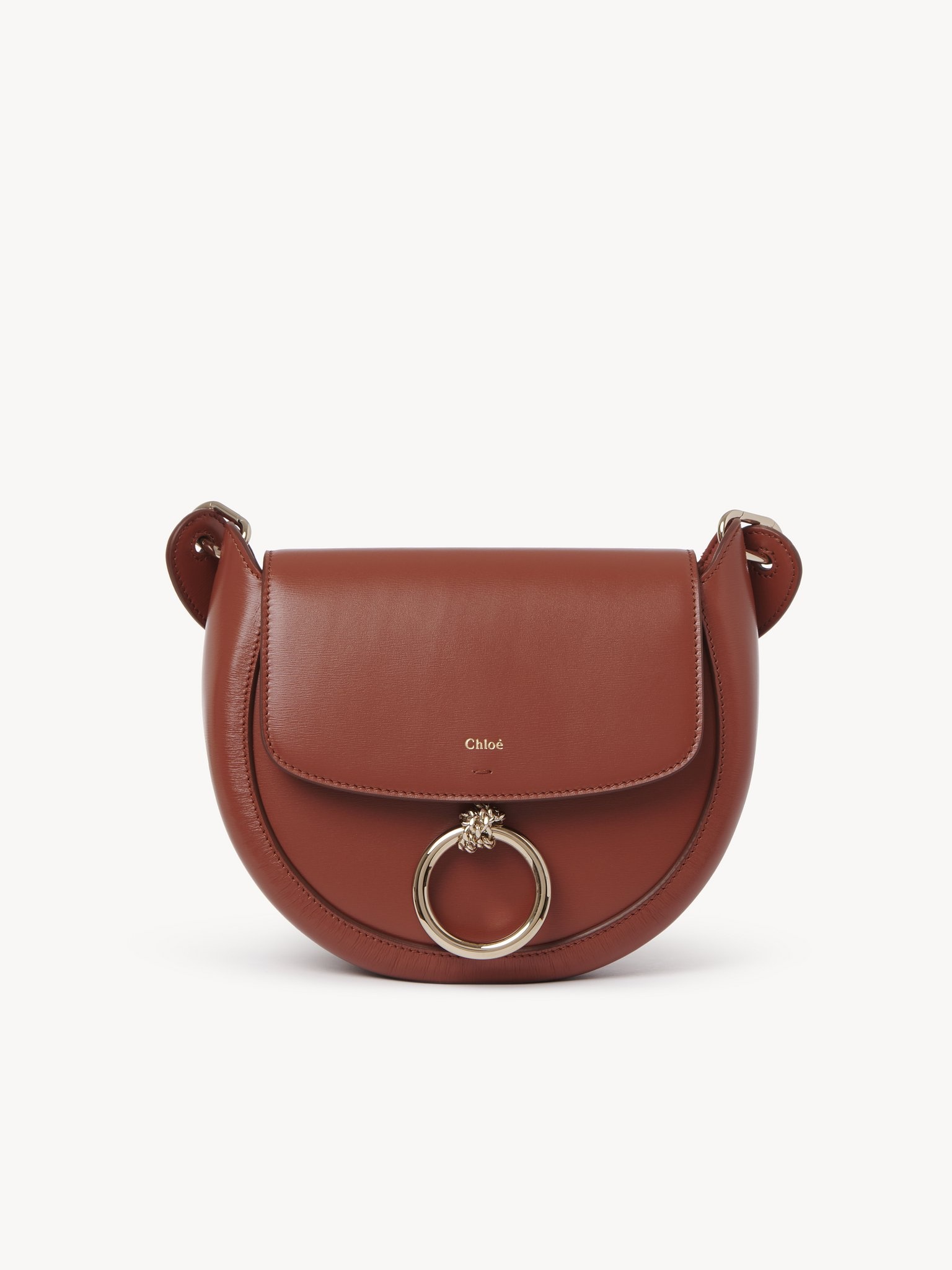 Crafted from box calfskin, this Arlène small cross-body bag has a round shape and a signature metallic closure inspired by vintage Chloé bags. The gold-toned jewelry loop is embellished with a knotted chain. The flap opens to reveal a roomy main compartment and a zippered compartment. The removable, adjustable strap allows for cross-body and shoulder carry. All about Arlène... Exuding a casual, bohemian attitude, Arlène features round lines and refined hardware inspired by vintage Chloé bags. Various materials offer versatile styling options. PRODUCT DETAILS Small cross-body bag in box calfskin Main material: Calfskin Flap lining: Calfskin Main lining: Lambskin Carry: Cross-body & shoulder - Magnetic closure - 1 main compartment - 1 inside zippered compartment - Removable & adjustable strap Comes with a dust bag - Width: 8.7" (22 cm) - Height: 6.9" (17.5 cm) - Depth: 3" (7.5 cm) - Min. strap drop: 15.7" (40 cm) - Max. strap drop: 19.7" (50 cm) This small purse is made from semi-aniline leather. The half-transparent finish imparts a robust nature to the product while preserving its natural character. Respect care instructions on the leaflet. To make this product, Chloé worked with Leather Working Group (LWG) certified leather manufacturers. LWG certifies tanneries based on their water and energy usage, management of chemicals, solid waste, and wastewater. Color: Autumn Leaf Item code: CHC23AS141J38845