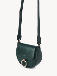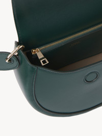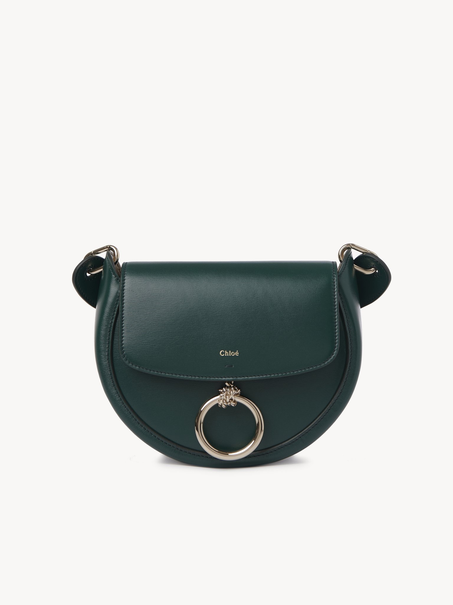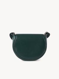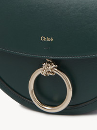 Crafted from box calfskin, this Arlène small crossbody bag has a round shape and a signature metallic closure inspired by vintage Chloé bags. The gold-toned jewelry loop is embellished with a knotted chain. The flap opens to reveal a roomy main compartment and a zippered compartment. The removable, adjustable strap allows for cross-body and shoulder carry. All about Arlène... Exuding a casual, bohemian attitude, Arlène features round lines and refined hardware inspired by vintage Chloé bags. Various materials offer versatile styling options. PRODUCT DETAILS Small crossbody bag in box calfskin Main material: Calfskin Flap lining: Calfskin Main lining: Lambskin Carry: Cross-body & shoulder - Magnetic closure - 1 main compartment - 1 inside zippered compartment - Removable & adjustable strap Comes with a dust bag - Width: 8.7" (22 cm) - Height: 6.9" (17.5 cm) - Depth: 3" (7.5 cm) - Min. strap drop: 15.7" (40 cm) - Max. strap drop: 19.7" (50 cm) This small bag is made from semi-aniline leather. The half-transparent finish imparts a robust nature to the product while preserving its natural character. Respect care instructions on the leaflet. To make this product, Chloé worked with Leather Working Group (LWG) certified leather manufacturers. LWG certifies tanneries based on their water and energy usage, management of chemicals, solid waste, and wastewater. Color: Marble Green Item code: CHC23AS141J383H1