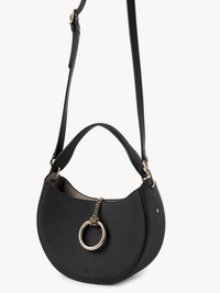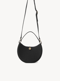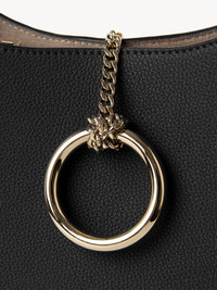 Crafted from grained calfskin, this Arlène small hobo bag has a round shape and a signature metallic closure inspired by vintage Chloé bags. The gold-toned jewelry loop is embellished with a knotted chain that also closes the top. The practical small purse combines two main compartments with a central zippered pocket. The top handle and adjustable straps allow for arm, shoulder and cross-body styling, making this a truly versatile accessory. All about Arlène... Exuding a casual, bohemian attitude, Arlène features round lines and refined hardware inspired by vintage Chloé bags. Various materials offer versatile styling options. PRODUCT DETAILS Small hobo bag in grained calfskin Main lining: Split calfskin Carry: Arm, shoulder & cross-body - Top zipper & chain closure - 2 main compartments - 1 central zippered pocket - Adjustable strap Comes with a dust bag - Width: 8.7" (22 cm) - Height: 5.9" (15 cm) - Depth: 3.1" (8 cm) - Handle drop: 5.1" (13 cm) - Min. strap drop: 18.9" (48 cm) - Max. strap drop: 21.9” (55.5 cm) This hand bag is made from semi-aniline leather. The half-transparent finish imparts a robust nature to the product while preserving its natural character. Respect care instructions on the leaflet. To make this product, Chloé worked with Leather Working Group (LWG) certified leather manufacturers. LWG certifies tanneries based on their water and energy usage, management of chemicals, solid waste, and wastewater. Color: Black Item code: CHC23AS164K61001