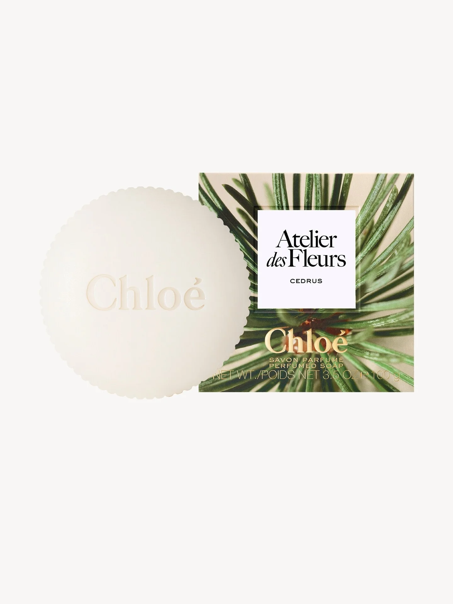 DESCRIPTION Chloe is now extending the Atelier des Fleurs experience in a series of original beauty rituals. The Maison has drawn on the essences of specific flowers to complete the perfume ritual with a skincare line for the body. On contact with water, this soap lathers into an airy, soothing foam. Infused with Cedrus, one of the line's signature fragrances, it leaves the hands cleansed and elegantly scented with a rich aroma of resin, amber and musky cedar. This ivory soap is engraved with the Chloe logo and finished with the line's signature pleating. The vegan formula is free of artificial colors and contains at least 95% ingredients of natural origin. PRODUCT DETAILS Size: 3.5 oz (100 g) Soap with beautiful signature aromas Olfactive family: woody Distinctive feature: a woody, sparkling, sensual scent How to use: lather the woody, musky Cedrus Soap in the palms of your hands with warm water, then gently massage in from the wrists to the fingertips before rinsing. Item code: CHCA50198713