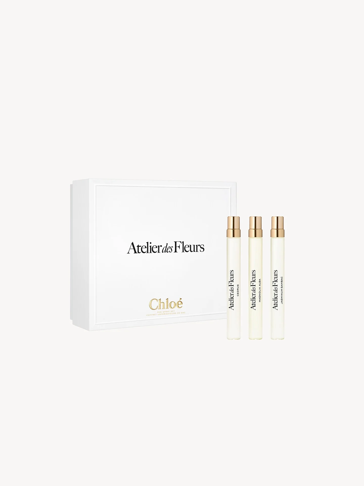 DESCRIPTION Capturing the finest botanical ingredients, this Chloe perfume gift set features three iconic Atelier des Fleurs fragrances developed in collaboration with renowned perfumers. Inside, you will find Cedrus, Magnolia Alba and Jasminum Sambac Eau de Parfum in a penspray format perfect for travel. About the fragrances... Cedrus, a woody Eau de Parfum, reveals either tender and subtle or warm and musky notes. Magnolia Alba, a smooth Eau de Parfum, unveils the fresh, almost creamy scent of magnolia petals. Jasminum Sambac, a velvety Eau de Parfum, features jasmine petals with soft and sunny floral notes. PRODUCT DETAILS Discovery perfume gift set of 3 Eau de Parfum pensprays - Cedrus 0.34 fl oz (10 ml) - Magnolia Alba 0.34 fl oz (10 ml) - Jasminum Sambac 0.34 fl oz (10 ml) Item code: CHCA50215805