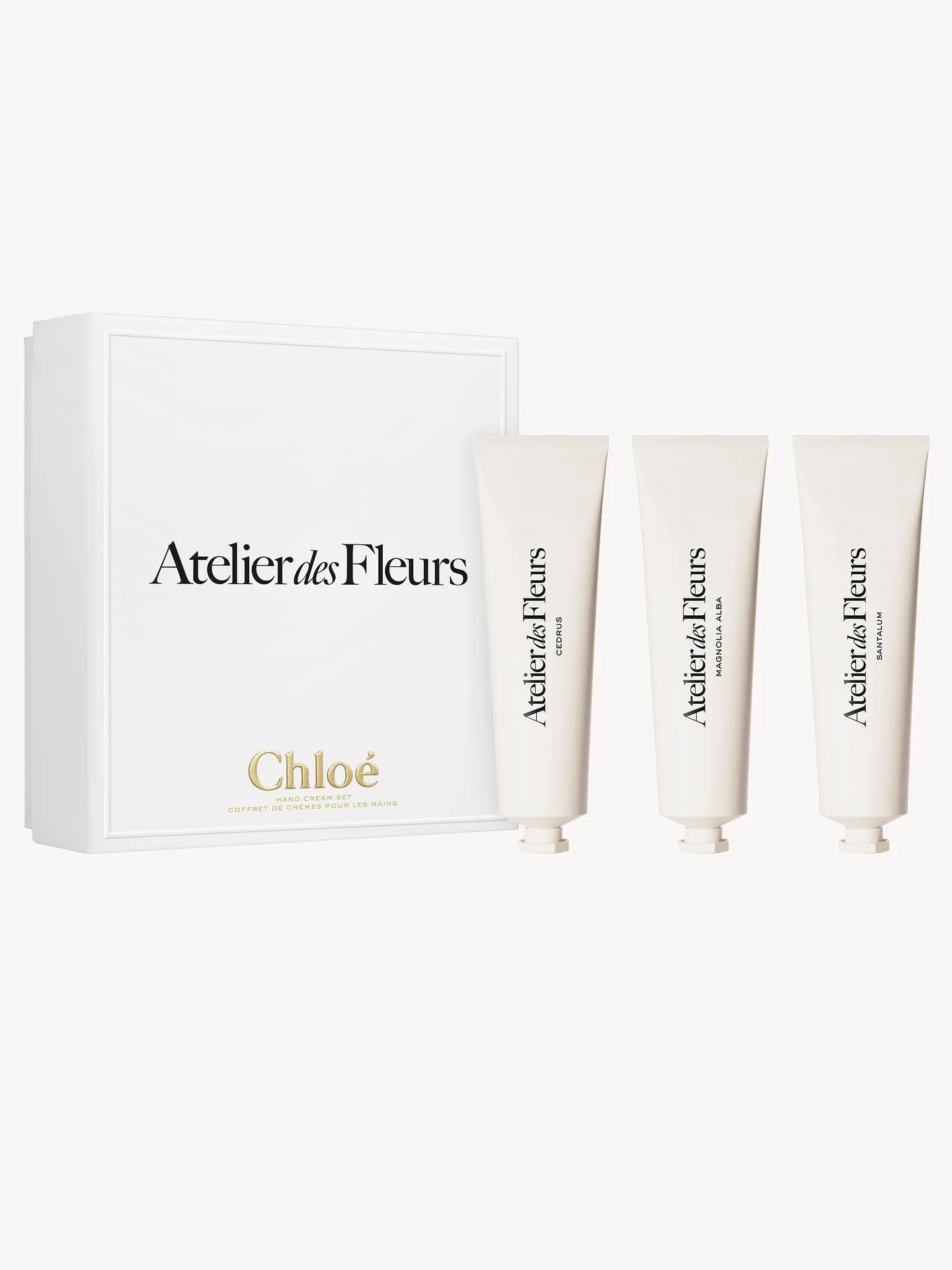 DESCRIPTION This Chloe Atelier des Fleurs Hand Cream Gift Set features rich, silky hand creams that capture the spirit of the festive season and the essence of flowers. Cedrus, Magnolia Alba and Santalum perfumed hand creams are each presented in an elegant tube in the line's signature ivory color. The vegan formula contains a minimum of 96% ingredients of natural origin. About the hand creams... - Cedrus reveals resin, amber and musky cedar notes. - Magnolia Alba's fresh, floral notes evoke the distinctive aroma of magnolia’s early spring blossoms. - Santalum features the comforting, enveloping and sensual aroma of sandalwood. PRODUCT DETAILS This Atelier des Fleurs Hand Cream Gift Set contains: - Cedrus 1.7 oz (50 ml) perfumed hand cream - Magnolia Alba 1.7 oz (50 ml) perfumed hand cream - Santalum 1.7 oz (50 ml) perfumed hand cream How to use: apply from the wrists to the tips of the nails, massaging into the skin until absorbed. Item code: CHCA50195360
