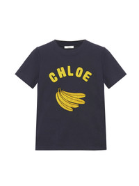 Crew-neck baby fit logo T-shirt in light organic cotton jersey, featuring a contrast Chloe logo and banana print. PRODUCT DETAILS Baby fit T-shirt outer shell: 100% Cotton Fit: fitted - The model is 5'10" (178 cm) and wears a prototype in size 36 - Printed T-shirt - Slips on Care: gentle wash 90°F (30°C) An organic cotton farming system sustains the health of soils, ecosystems and people by eliminating the use of toxic and persistent organic pollutants and increasing water conservation. Color: Twilight Blue Item code: CH25SJH08187405