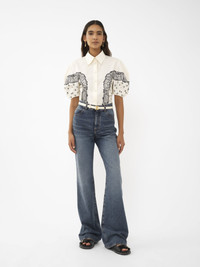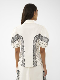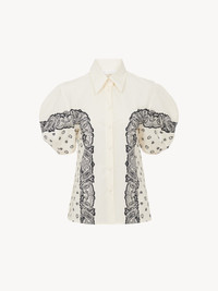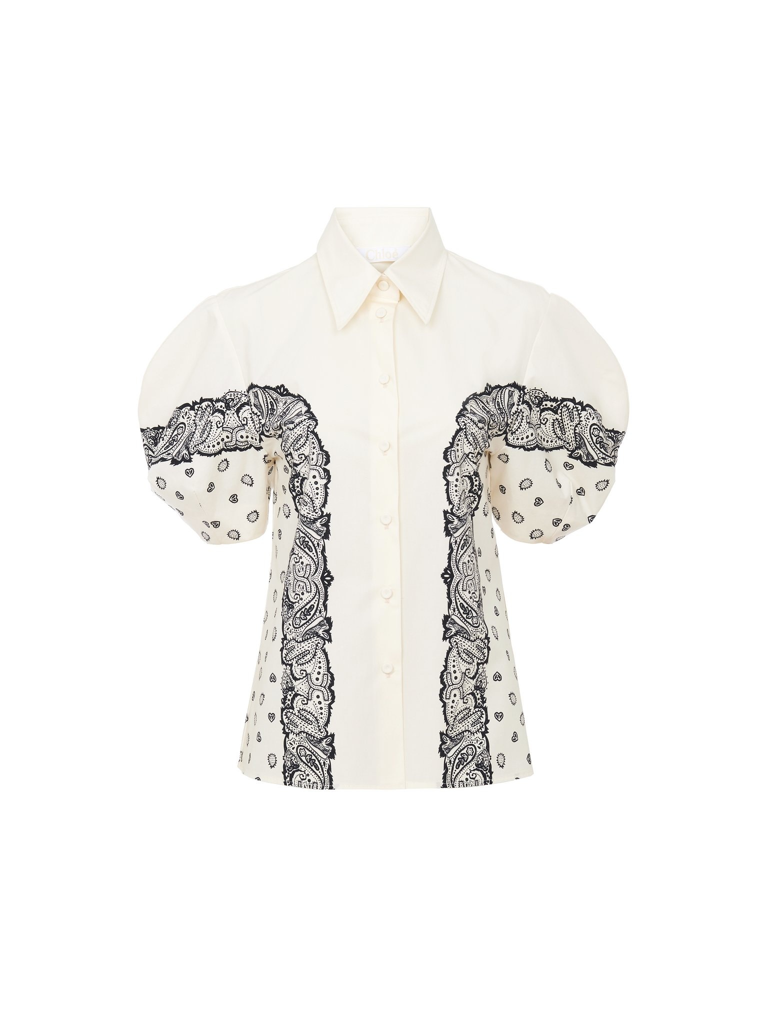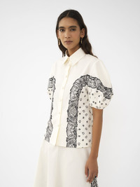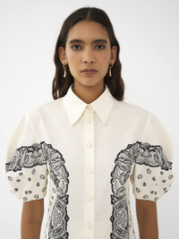 Crafted from organic cotton poplin, this printed shirt features an exclusive bandana-inspired motif that combines a number of the Maison's icons (Marcie, Nama, Jemma) with seasonal patterns (heart, cactus, fruit). Short balloon sleeves create a softly sculptured silhouette. PRODUCT DETAILS Printed shirt main material: 100% Cotton Care: dry cleaning only Fit: straight - The model is 5'10" (178 cm) and wears a prototype in size 36 - Short-sleeve cotton shirt - Buttons through front An organic cotton farming system sustains the health of soils, ecosystems and people by eliminating the use of toxic and persistent organic pollutants and increasing water conservation. Color: Black & White Item code: CHC24UHT17300905