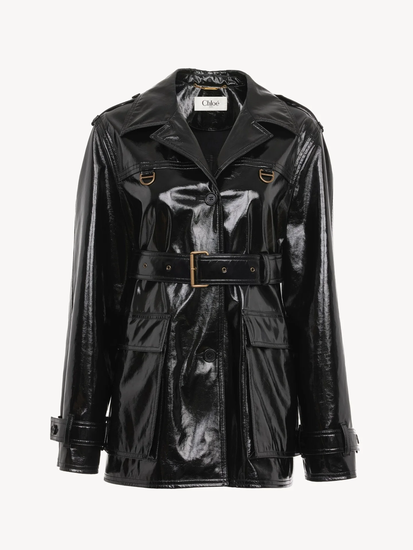 DESCRIPTION Belted jacket in shiny coated cotton, featuring maxi flap pockets, engraved horn buttons and gold-tone hardware. PRODUCT DETAILS Belted jacket outer shell: 100% Cotton Lining: 62% Viscose, 38% Cotton Buttons: 100% Water buffalo horn Fit: straight - The model is 5'10" (178 cm) and wears a prototype in size 36 - Utilitarian jacket - Engraved horn buttons through front, at cuffs & at shoulders - Maxi front flap pockets with top & side entry - Gold metal Chloe logo triangle at left pocket - Shoulder and cuff tabs - Gold-tone hardware at chest Color: Black Item code: CH25AVE15947001 CARE INSTRUCTIONS To preserve the integrity of your garment, please refrain from washing, entrusting its care to professional cleaning services for optimal maintenance. This garment cannot withstand any bleaching agent. To maintain its shape, gently iron this garment at a maximum sole plate temperature of 110°C, taking care to avoid any harsh pressure while ironing. Entrust this garment to a specialist for mild cleaning with tetrachloroethylene and solvent F, ensuring its delicate nature is maintained with the most care. To maintain its delicate nature, do not wet clean this garment. To best preserve its form and texture, please do not tumble dry this garment. TRACEABILITY Better traceability is central to improving our materials as well as social and environmental practices. Dyeing: Italy Finishing: Italy Weaving: Italy