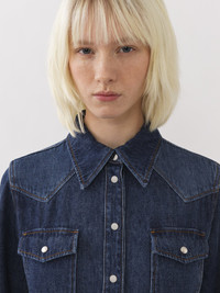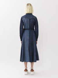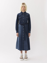 Part of the Fall-Winter 2023 collection's strong denim statement, this belted midi shirt dress is crafted from a recycled cotton and hemp blend Chloé denim patchwork. Laser-washed to achieve a palette of three shades, the denim patches are stitched together in a checkerboard pattern. Western-inspired stitching details the shoulders, while patch pockets and a self-fabric belt finish this easy-wearing piece. Chloé-engraved snap buttons run through the front and detail the cuffs. PRODUCT DETAILS Belted midi shirt dress main material: 80% Cotton, 20% Linen Care: gentle wash 85°F (30°C) Fit: mid-length, long sleeved - The model is 5’10” (178 cm) and wears a prototype in size 36 - Denim midi dress - Chloé-engraved snap buttons through front - Flap chest pockets - Self-fabric belt This denim is a blend of recycled cotton and natural fibers (hemp or linen), both considered lower-impact materials. Recycled cotton keeps its natural softness and inherent quality, with a reduced environmental impact. Using recycled cotton enables us to extend the lifespan of a fiber that has already been produced. Linen, hemp and ramie cultivations emit less greenhouse gases and require less water compared to other conventional natural fibers, which is why they are considered lower-impact materials by their nature. Color: Blue Multicolor Item code: CHC23ADR141584ZA