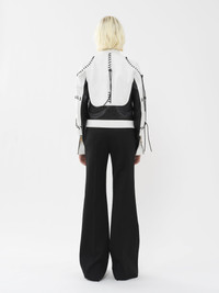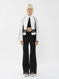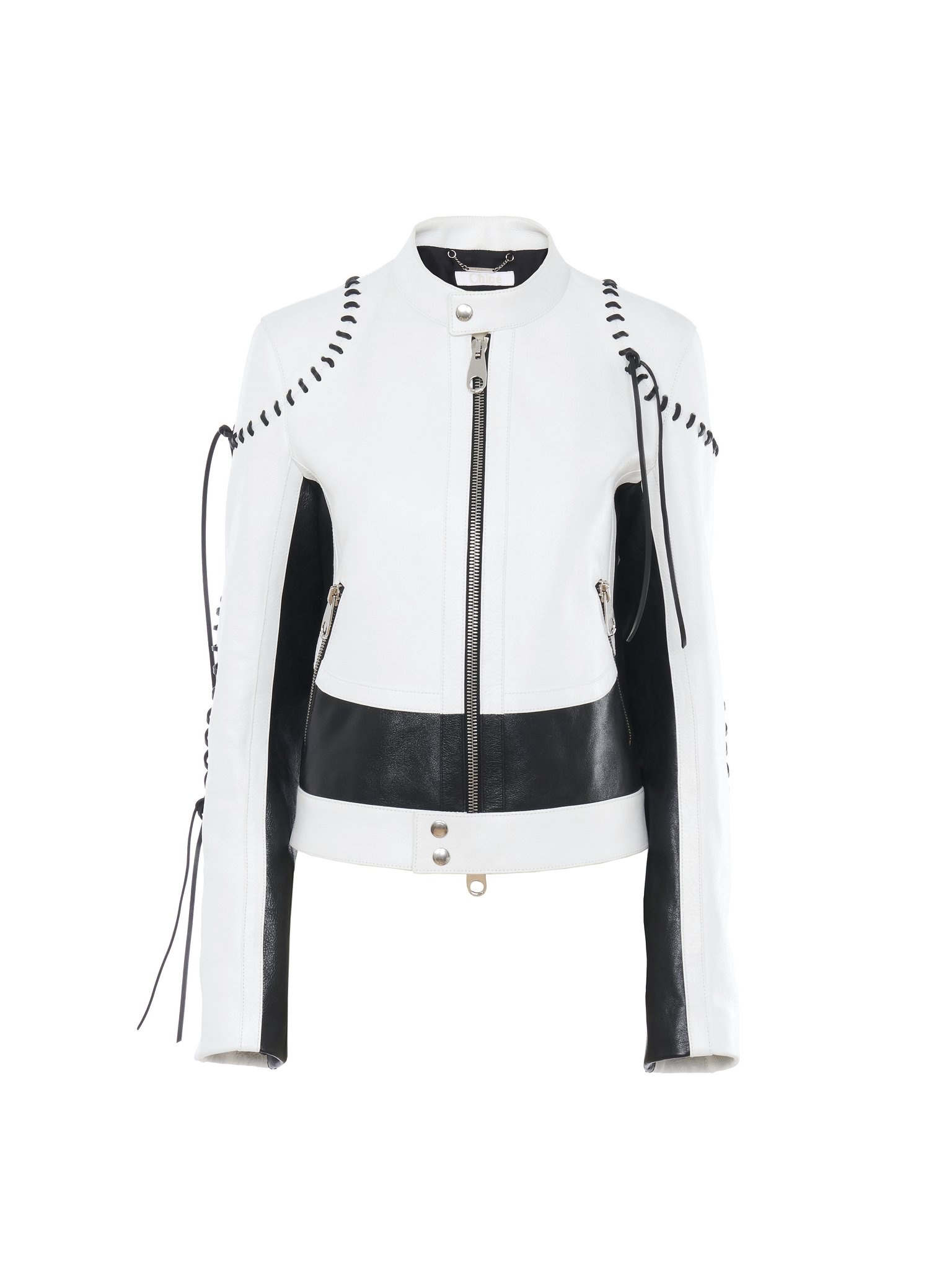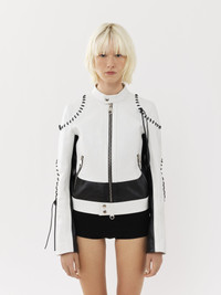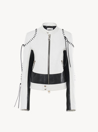This biker jacket is crafted from bicolor calfskin for a graphic, sporty look. The zippered front and pockets play into the motorcycle aesthetic, while knotted whipstitches along the seams add a crafty twist. PRODUCT DETAILS Biker jacket main material: 100% Calfskin Lining: 100% Silk Padding: 100% Polyester Cord: 100% Calfskin Care: cleaning by a leather specialist only Fit: short, fitted - The model is 5’10” (178 cm) and wears a prototype in size 36 - Leather jacket - Chloé-engraved snap button - Front zipper & wrist zipper - Zippered pockets To make this product, Chloé worked with Leather Working Group (LWG) certified leather manufacturers. LWG certifies tanneries based on their water and energy usage, management of chemicals, solid waste, and wastewater. Color: Black & White Item code: CHC23UCV02203905