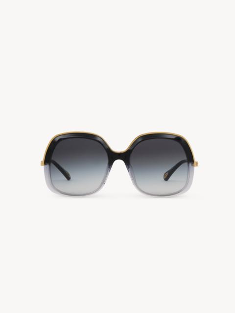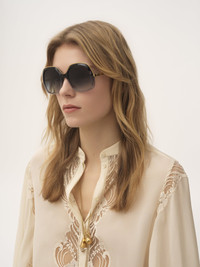 These Leia square sunglasses pair a 70s-style frame in gradient gray lower-impact acetate with gradient blue lenses. An ornamental gold metal insert adorns the top. The Chloe logo details the temples, while drop-shaped openings at the temple tips make these sunglasses compatible with Chloe's eyewear jewelry. PRODUCT DETAILS Square sunglasses in lower-impact acetate, gold metal & bio-based nylon - 100% UVA and UVB protection - Not prescription friendly - Chloe logo engraved on the temples - Filter category: 3 These sunglasses come with a case and lens cloth - Lens: 2.2" (56 mm) - Bridge: 0.7" (19 mm) - Temple: 5.3" (135 mm) - Gradient gray lower-impact acetate & light gold metal frame - Gradient blue lenses Item code: CH25AEK0327046