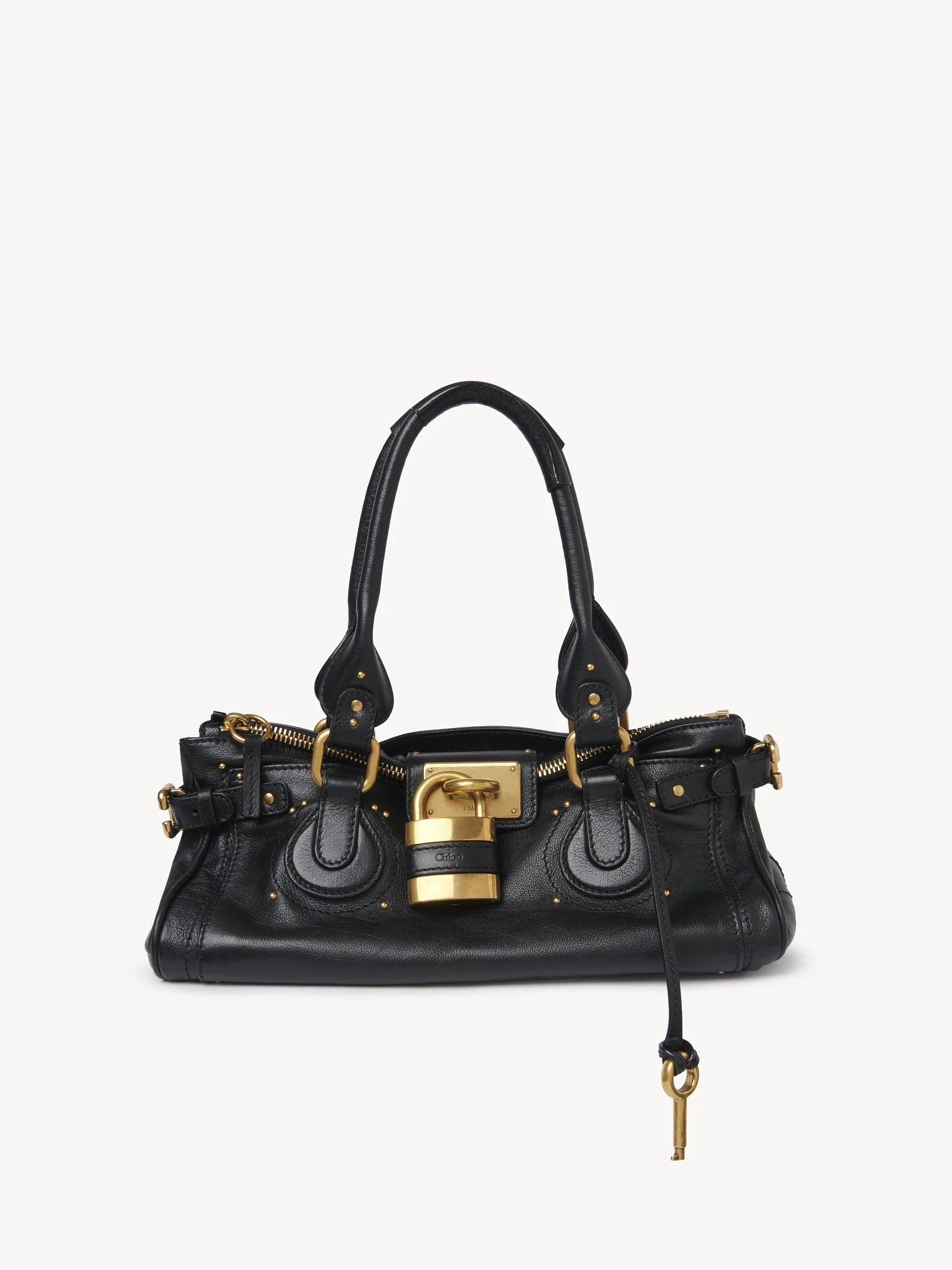 Rooted in the Maison's heritage, the iconic Paddington bag returns for its 20th anniversary with an updated design. Crafted from grained buffalo leather in a slouchy silhouette, it is lighter than the original bag, with a single zip for easy opening. The oversized padlock and C-shaped buckles add signature detail, while 52 studs pay tribute to the year in which the Maison was founded. PRODUCT DETAILS Paddington bag in grained buffalo leather Main material: Buffalo leather Main lining: Cotton Inside pocket lining: Cotton Outside pockets lining: Suede calfskin Padlock: Aluminum Carry: Hand & shoulder - 1 roomy main compartment - 1 front flat pocket - 1 back flat pocket - 1 inside zipped pocket - Zip closure Comes with a dust bag - Width: 14.2" (36 cm) - Height: 7.1" (18 cm) - Depth: 7.1" (18 cm) - Handle drop: 8.3" (21 cm) To make this product, Chloe worked with Leather Working Group (LWG) certified leather manufacturers. LWG certifies tanneries based on their water and energy usage, management of chemicals, solid waste, and wastewater. Color: Black Item code: CH25WS802P75001