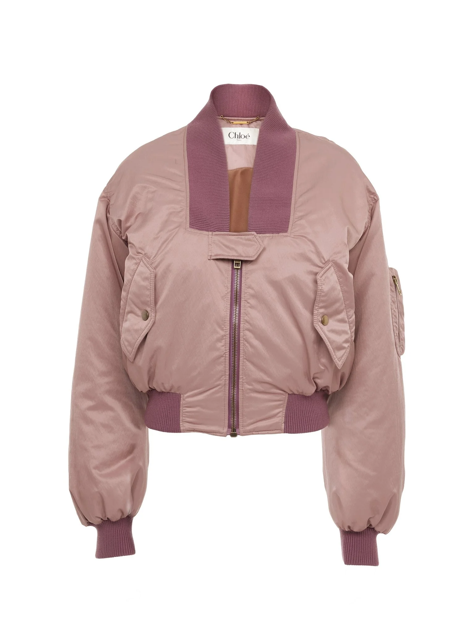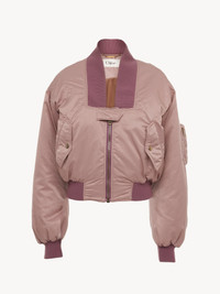 Maxi-collar bomber jacket in nylon with contrast ribbed trims, buttoned flap pockets and a zippered sleeve pocket. PRODUCT DETAILS Bomber jacket outer shell: 58% Polyester, 42% Polyamide Lining: 100% Polyester Collar & cuffs: 88% Wool, 9% Polyamide, 3% Elastane Fit: straight - The model is 5'10" (178 cm) and wears a prototype in size 36 - Chloe jacket - Front zipper & snap-button tab - Front flap pockets with snap buttons - Zippered sleeve pocket Color: Ginger Brown Item code: CH25AVE1611327T