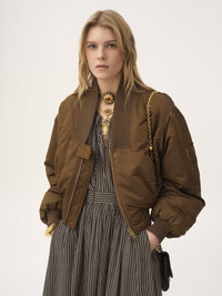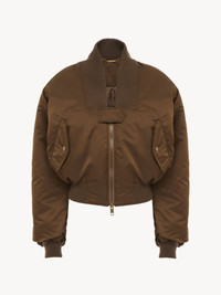 Bomber jacket in nylon with contrast ribbed trims at the maxi collar, waist and cuffs. Snap-button flap pockets and a zippered sleeve pocket finish this piece. PRODUCT DETAILS Bomber jacket outer shell: 58% Polyester, 42% Polyamide Lining: 100% Polyester Collar & cuffs: 88% Wool, 9% Polyamide, 3% Elastane Fit: straight - The model is 5'10" (178 cm) and wears a prototype in size 36 - Chloe jacket - Front zipper & snap-button tab - Front flap pockets with snap buttons - Zippered sleeve pocket Color: Authentic Brown Item code: CH25AVE16113233