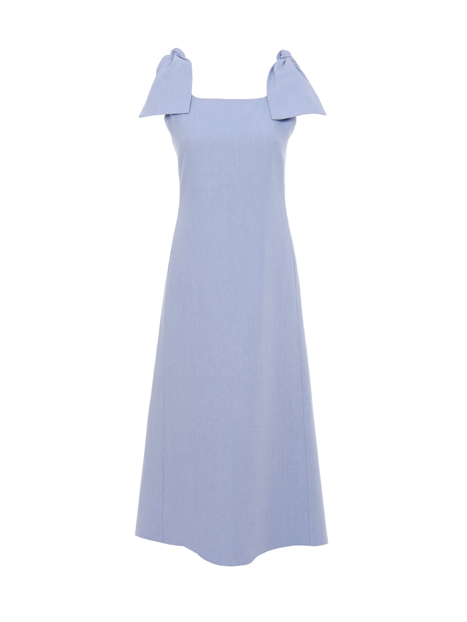 Crafted from linen canvas for a summer mood, this sun dress features generous bows applied to the straps. Permeating the Spring-Summer '24 collection, the bow adds romantic detail stripped of frills for an effortless attitude. Easy to wear, this linen midi dress is a feminine staple for the warmer months. PRODUCT DETAILS Sun dress main material: 100% Linen Lining: 100% Cotton Care: dry cleaning only Fit: sleeveless, midi length - The model is 5'10" (178 cm) and wears a prototype in size 34 - Linen midi dress - Back zipper Linen, hemp and ramie cultivations emit less greenhouse gases and require less water compared to other conventional natural fibers, which is why they are considered lower-impact materials by nature. Color: Pebble Blue Item code: CHC24SRO281304E0