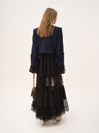 DESCRIPTION Boxy collarless jacket in lower-impact wool check, featuring gold-tone buttons, flap pockets and maxi turn-up cuffs. PRODUCT DETAILS Boxy collarless jacket outer shell: 90% Wool, 10% Polyamide Lining: 62% Viscose, 38% Cotton Fit: boxy - The model is 5'10" (178 cm) and wears a prototype in size 36 - Chloe wool jacket - Gold-tone buttons through front - Chest flap pocket - Front flap pockets The wool used in this product comes from a farm that respects animal welfare, maintains soil health, protects biodiversity and promotes native species. Color: Dark Indigo Item code: CH25AVE1209648G CARE INSTRUCTIONS To preserve the integrity of your garment, please refrain from washing, entrusting its care to professional cleaning services for optimal maintenance. This garment cannot withstand any bleaching agent. To maintain its shape, gently iron this garment at a maximum sole plate temperature of 110°C, taking care to avoid any harsh pressure while ironing. Entrust this garment to a specialist for mild cleaning with tetrachloroethylene and solvent F, ensuring its delicate nature is maintained with the most care. To maintain its delicate nature, do not wet clean this garment. To best preserve its form and texture, please do not tumble dry this garment. TRACEABILITY Better traceability is central to improving our materials as well as social and environmental practices. Dyeing: Italy Finishing: Italy Weaving: Italy