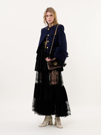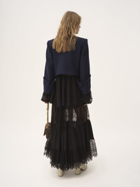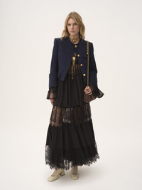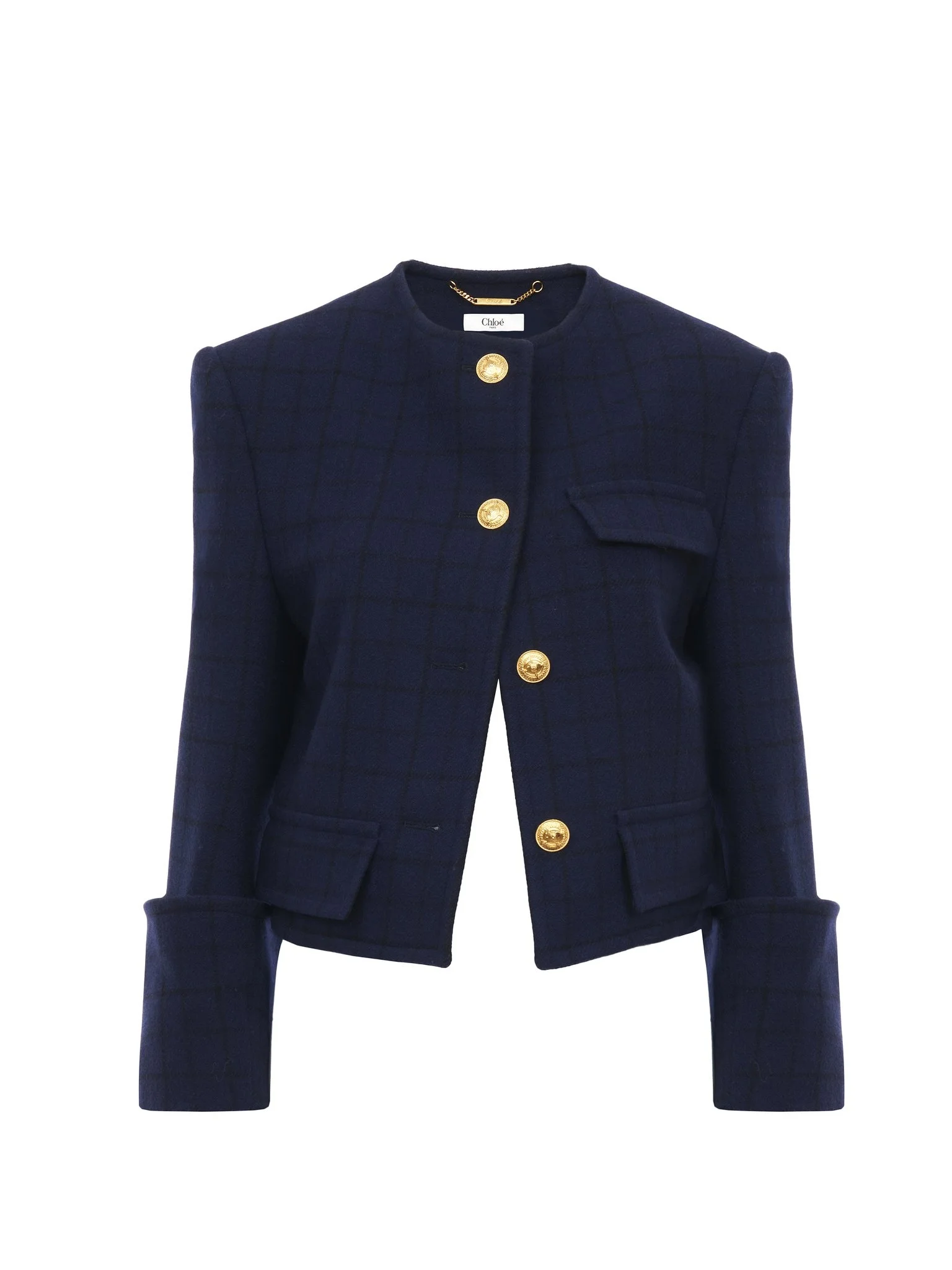 Boxy collarless jacket in lower-impact wool check, featuring gold-tone buttons, flap pockets and maxi turn-up cuffs. PRODUCT DETAILS Boxy collarless jacket outer shell: 90% Wool, 10% Polyamide Lining: 62% Viscose, 38% Cotton Fit: boxy - The model is 5'10" (178 cm) and wears a prototype in size 36 - Chloe wool jacket - Gold-tone buttons through front - Chest flap pocket - Front flap pockets The wool used in this product comes from a farm that respects animal welfare, maintains soil health, protects biodiversity and promotes native species. Color: Dark Indigo Item code: CH25AVE1209648G