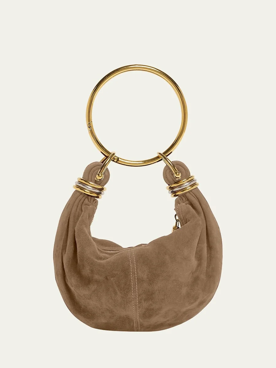 Chloe's suede hobo bag features a chic rounded shape, elevated by a unique bracelet handle adorned with stacked ring hardware Metal ring top handle Detachable shoulder strap Can be worn as a tophandle bracelet or shoulder/crossbody bag Zip top closure Lining: Suede Approx. 5.5"H x 8.2"W x 2.3"D Made in Italy