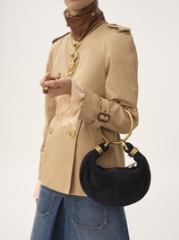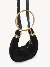 Inspired by the Maison's Archives, this mini Bracelet Hobo bag is crafted from suede lambskin. The supple, rounded shape is elevated by a bracelet handle and stacked bi-color rings at the ends. Carry the mini Bracelet bag in the hand, on the shoulder or crossbody. PRODUCT DETAILS Mini Bracelet Hobo bag in suede lambskin Main material: Lambskin Secondary material: Calfskin Main lining: Lambskin Carry: Hand, shoulder & crossbody - 1 main compartment - 1 inside flat pocket - 1 removable ring handle - 1 adjustable & removable strap - Zip closure Comes with a dust bag - Width: 8.3" (21 cm) - Height: 5.5" (14 cm) - Depth: 2.4" (6 cm) - Handle drop: 8.7" (22 cm) - Min. strap drop: 16.5" (42 cm) - Max. strap drop: 19.7" (50 cm) Color: Black Item code: CH25US623P57001