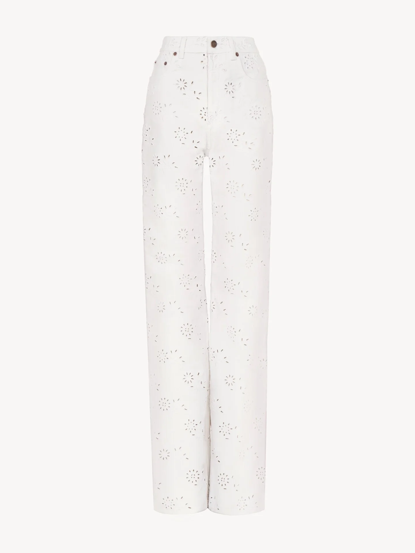 DESCRIPTION Cropped jeans in organic cotton denim with all-over floral broderie anglaise. PRODUCT DETAILS Cropped jeans outer shell: 100% Cotton Patch: 100% Calfskin Fit: straight, cropped - The model is 5'10" (178 cm) and wears a prototype in size 25 - Cropped denim pants - Front zipper & Chloe-engraved button fastening - Classic 5-pocket design - Belt loops - Leather Chloe patch at back An organic cotton farming system sustains the health of soils, ecosystems and people by eliminating the use of toxic and persistent organic pollutants and increasing water conservation. Color: White Item code: CH25ADP06260101 CARE INSTRUCTIONS To preserve the integrity of your garment wash it at a maximum of 30°C, using a mild process to protect its delicate nature. This garment cannot withstand any bleaching agent. To maintain its shape, gently iron this garment at a maximum sole plate temperature of 110°C, taking care to avoid any harsh pressure while ironing. Entrust this garment to a specialist for mild cleaning with tetrachloroethylene and solvent F, ensuring its delicate nature is maintained with the most care. To maintain its delicate nature, do not wet clean this garment. To best preserve its form and texture, please do not tumble dry this garment. TRACEABILITY Better traceability is central to improving our materials as well as social and environmental practices. Dyeing: Italy Weaving: Italy