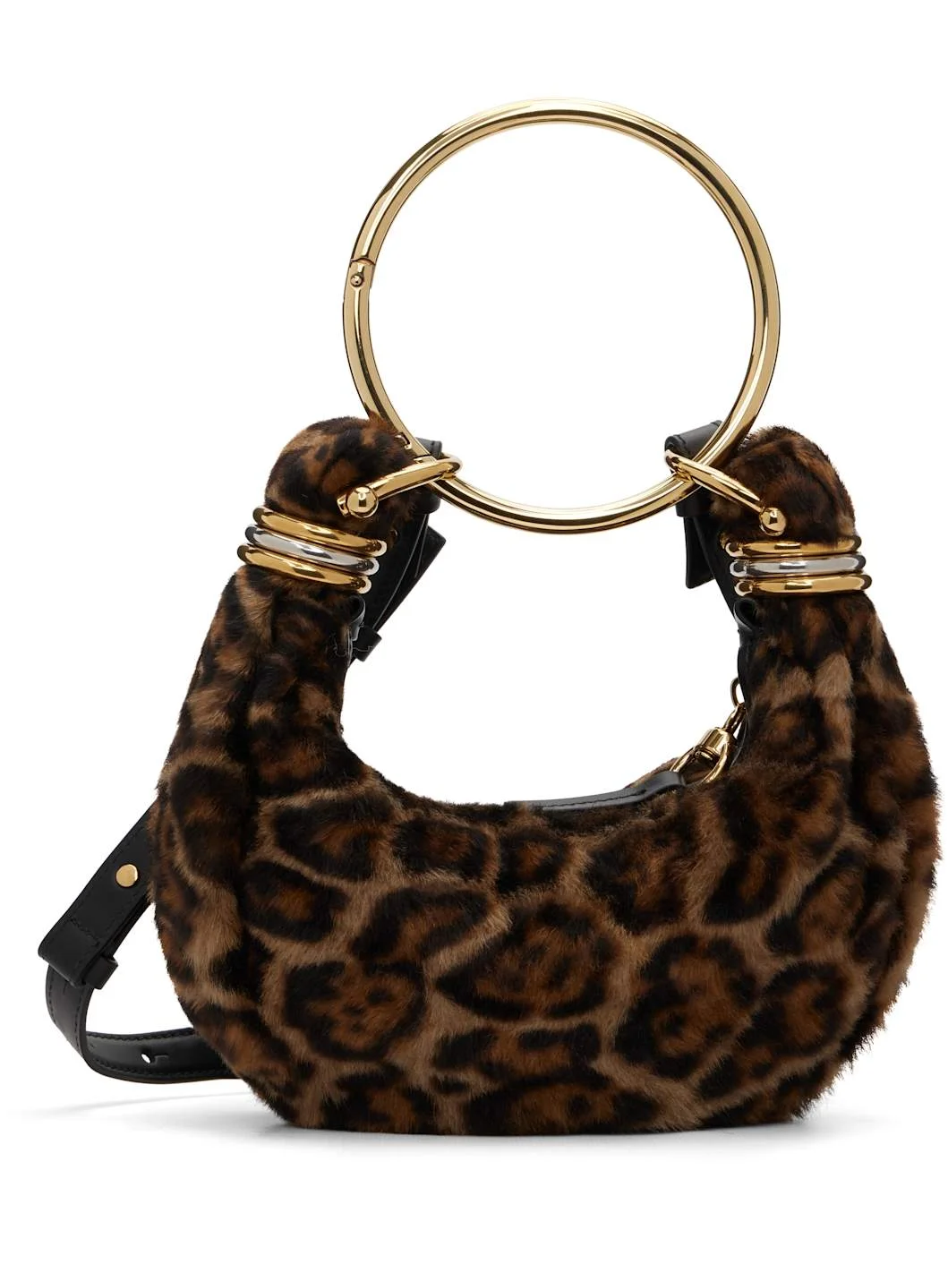 Shearling top handle bag. · LWG-certified shearling · Leopard pattern printed throughout · Detachable metal O-ring carry handle · Adjustable and detachable shoulder strap · Logo stamp at face · Hardware at sides · Zip closure · Patch pocket at interior · Calfskin suede lining · H6.5" x W9.5" x D1.5" Supplier color: Jungle Brown Lambskin. Made in Italy 252338F046009