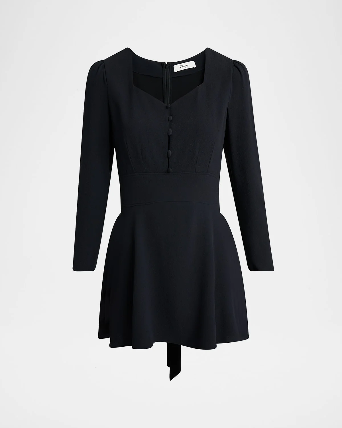Chloe dress featuring a button empire bust and a waist sash V neckline Long sleeves Mini length Aline silhouette Back zip Wool Dry clean Imported