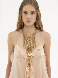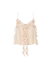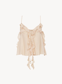 Camisole top in delicate silk charmeuse, featuring thin straps, ruffles and a front tie fastening with gold-toned metal tips. PRODUCT DETAILS Camisole top outer shell: 100% Silk Buttons: 100% Mother-of-pearl Fit: fluid - The model is 5'10" (178 cm) and wears a prototype in size 36 - Sleeveless top - Front tie with gold-toned metal tips - Mother-of-pearl buttons Care: dry cleaning only This product was made in collaboration with Akanjo, a certified WFTO supplier. Akanjo is a social enterprise located in Madagascar that places equal pay and employees' health & wellbeing at the core of their priorities. A long-standing partner of Chloe for 15 years, Akanjo is also committed to training and promoting craftsmanship. Color: Delicate Pink Item code: CH25SHT083296H6
