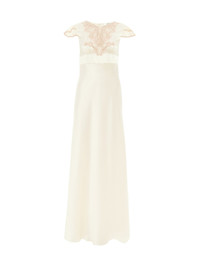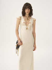 Cap-sleeve column dress in washed silk satin with lace inserts, gathered at the chest. PRODUCT DETAILS Column dress outer shell: 100% Silk Secondary material: 56% Cotton, 44% Polyamide Embroidery thread: 100% Polyester Fit: fluid, long - The model is 5'10" (178 cm) and wears a prototype in size 34 - Long silk dress - Fabric-covered button at back This product was made in collaboration with Akanjo, a certified WFTO supplier. Akanjo is a social enterprise located in Madagascar that places equal pay and employees' health & wellbeing at the core of their priorities. A long-standing partner of Chloe for 15 years, Akanjo is also committed to training and promoting craftsmanship. Color: Eden White Item code: CH25WRO79008112