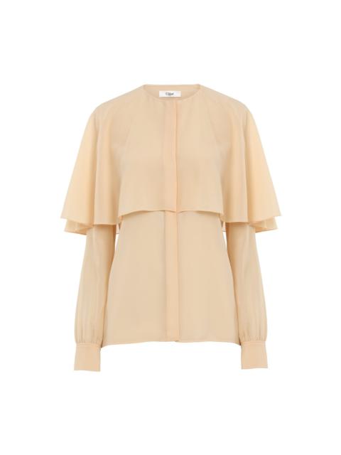 Cape blouse in organic silk georgette featuring a round-neck collar and buttoned cuffs. PRODUCT DETAILS Cape blouse outer shell: 100% Silk Buttons: 100% Mother-of-pearl Care: dry cleaning only Fit: straight, gathered sleeves - The model is 5'10" (178 cm) and wears a prototype in size 36 - Flou silk blouse - Covered button placket through front - Buttons at cuffs This product was made in collaboration with Akanjo, a certified WFTO supplier. Akanjo is a social enterprise located in Madagascar that places equal pay and employees' health & wellbeing at the core of their priorities. A long-standing partner of Chloé for 15 years, Akanjo is also committed to training and promoting craftsmanship. Color: Black Item code: CHC24AHT03002001