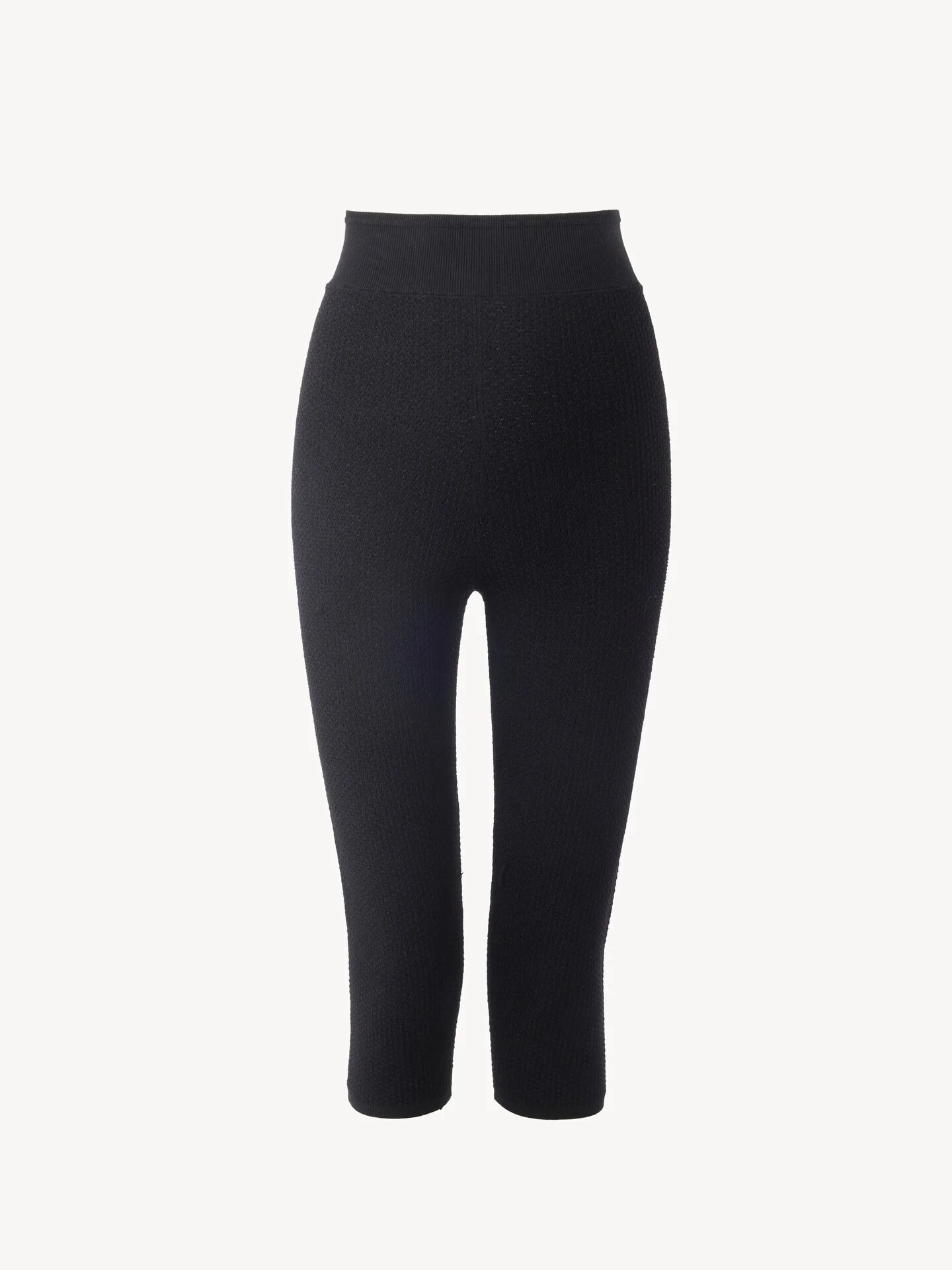 DESCRIPTION High-rise capri leggings in a honeycomb stretch knit with an elastic waistband. PRODUCT DETAILS Capri leggings outer shell: 83% Viscose, 17% Polyamide Fit: high-rise, fitted - The model is 5'10" (178 cm) and wears a prototype in size 36 - Slim pants - Elastic waistband Color: Black Item code: CH26SMT01770001 CARE INSTRUCTIONS To preserve the integrity of your garment, please refrain from washing, entrusting its care to professional cleaning services for optimal maintenance. This garment cannot withstand any bleaching agent. To maintain its shape, gently iron this garment at a maximum sole plate temperature of 110°C, taking care to avoid any harsh pressure while ironing. Entrust this garment to a specialist for mild cleaning with tetrachloroethylene and solvent F, ensuring its delicate nature is maintained with the most care. To best preserve its form and texture, please do not tumble dry this garment. To maintain its delicate nature, do not wet clean this garment.