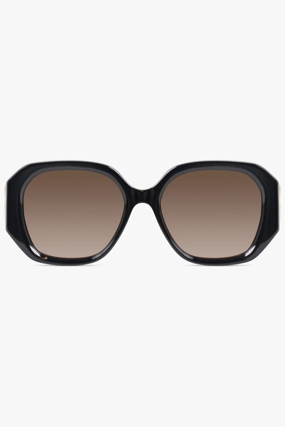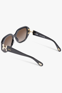- Rounded square sunglasses in lower-impact acetate & bio-based nylon - 100% UVA and UVB protection - Not prescription friendly - Chloe-engraved metal piece - Filter category: 3 - Black lower-impact acetate frame - Gradient grey lenses