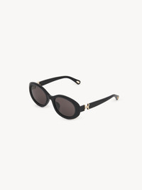 These Marcie oval sunglasses pair a shiny black beveled frame in lower-impact acetate with solid black lenses. The line's signature gold metal piece details the temples. Drop-shaped openings at the temple tips make these sunglasses compatible with Chloe's eyewear jewelry. PRODUCT DETAILS Oval sunglasses in lower-impact acetate & bio-based nylon - Asian fit - 100% UVA and UVB protection - Not prescription friendly - Chloe-engraved metal piece on the temples - Filter category: 3 These sunglasses come with a case and lens cloth - Lens: 2.1" (53 mm) - Bridge: 0.9" (22 mm) - Temple: 5.5" (140 mm) - Black lower-impact acetate frame - Solid black lenses Item code: CH25WEK0323K001