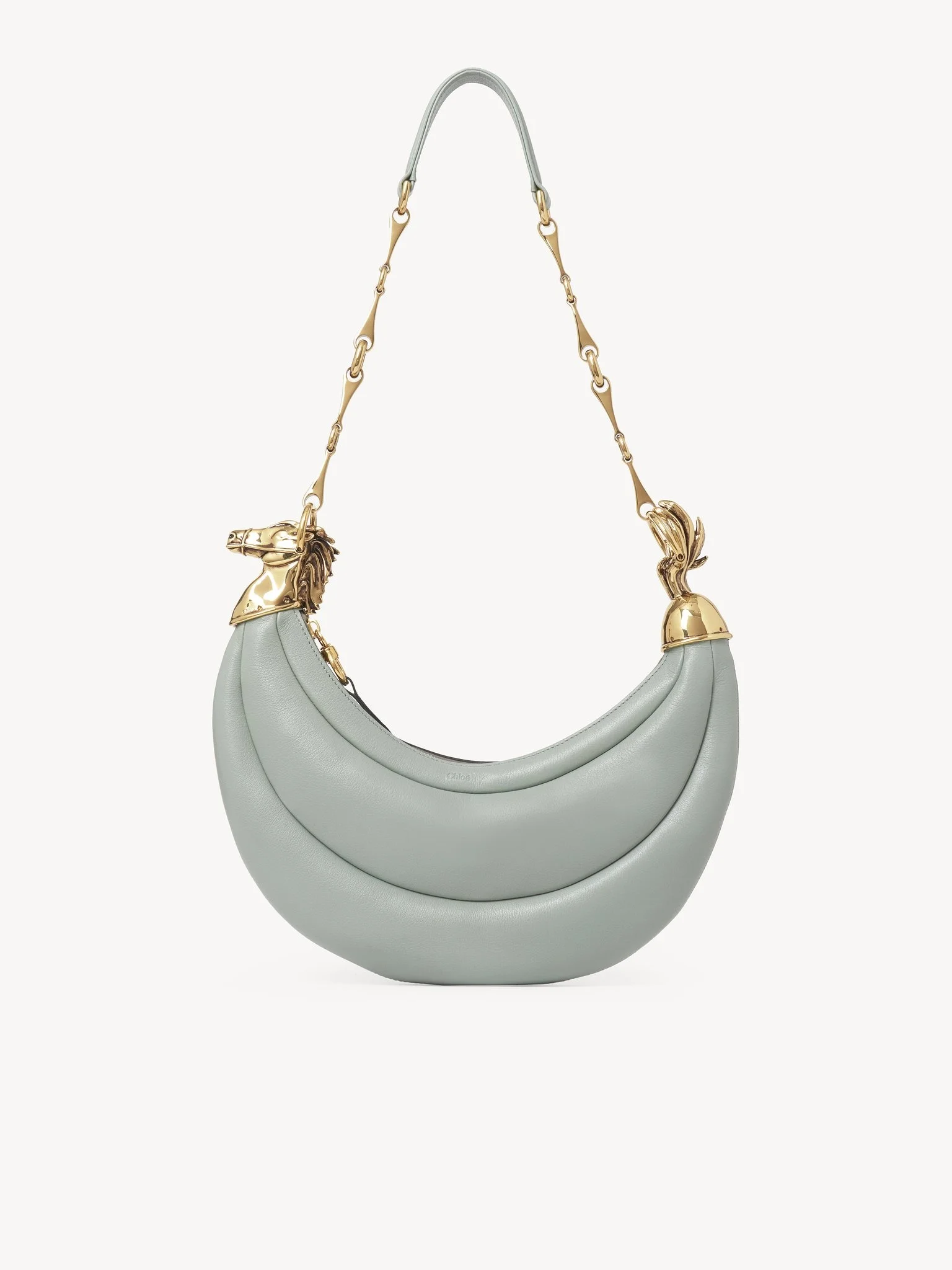 Crafted from grained buffalo leather, this Chain Horse shoulder bag has a supple saddle silhouette. Inspired by the equestrian world, it features jewelry embellishment with a gold-tone horse and a horsebit chain. PRODUCT DETAILS Chain Horse shoulder bag in grained buffalo leather Main material: Buffalo leather Secondary material: Lambskin Main lining: Calfskin Carry: Shoulder - 1 main compartment - 1 inside flat pocket - Zip closure Comes with a dust bag - Width: 13" (33 cm) - Height: 5.5" (14 cm) - Depth: 2.8" (7 cm) - Strap drop: 17.7" (45 cm) To make this product, Chloe worked with Leather Working Group (LWG) certified leather manufacturers. LWG certifies tanneries based on their water and energy usage, management of chemicals, solid waste, and wastewater. Color: Bluish Green Item code: CH25AS354O3738T