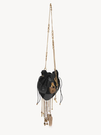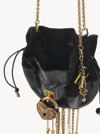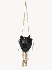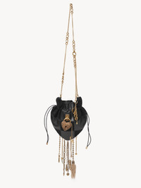 Crafted from a patchwork of suede goatskin and grained buffalo leather, the Chateau Treasures crossbody bag has a heart-shaped silhouette accentuated by a drawstring closure. An oversized ornamental heart padlock details the front while multiple charms in different sizes and textures dangle from chains at the base of the bag. Finished with Chloe letter charms, the adjustable chain strap allows for shoulder and crossbody wear. PRODUCT DETAILS Chateau Treasures crossbody bag in a suede goatskin & grained buffalo leather patchwork Main material: Buffalo leather Secondary material: Goatskin Main lining: Lambskin Carry: Shoulder & crossbody - 1 main compartment - 1 adjustable chain shoulder strap - Drawstring closure Comes with a dust bag - Width: 11.8" (30 cm) - Height: 10.2" (26 cm) - Depth: 2" (5 cm) - Chain drop: 21.7" (55 cm) To make this product, Chloe worked with Leather Working Group (LWG) certified leather manufacturers. LWG certifies tanneries based on their water and energy usage, management of chemicals, solid waste, and wastewater. Color: Black Item code: CH25WS712Q24001