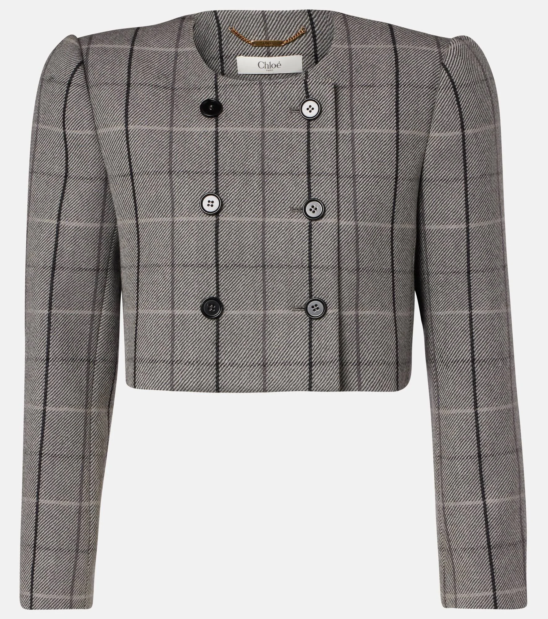 Renowned for its free-spirited aesthetic, Chloe's designs are characterized by romance with a Parisian flair. Made purely from wool, this jacket is a double-breasted piece with a checked pattern and cropped silhouette. Product Details - Material: 100% wool - Care instructions: dry clean - Made in Slovakia - Designer color name: Grey-White 2 - Item color: gray - Lining: 51% viscose, 49% cotton - Details: 100% horn - Contains non-textile parts of animal origin - Closure: double-breasted (six buttons) - Shoulder pads - Item number: P01130679 Size & Fit - True to size - Shoulder pad inserts - Cinched waist - Non-stretchy fabric - Cropped - The model seen in the picture is 178cm-5'10" and wearing a size FR 36