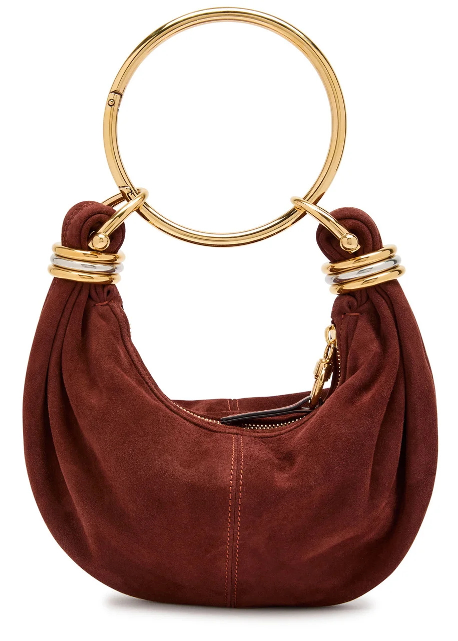 Info & Care Chloe suede top handle bag Detachable metal hoop top handle, detachable adjustable leather shoulder strap, metallic designer stamp, two-tone metal hardware, internal slip pocket, leather lining Zip fastening at top Size & Fit Width: 10 inches/ 25.5cm Height: 6 inches/ 15.5cm Depth: 2.5 inches/ 6.5cm Top handle drop: 4.5 inches/ 11.5cm Min. shoulder strap drop: 13 inches/ 33cm Max. shoulder strap drop: 16 inches/ 40.5cm