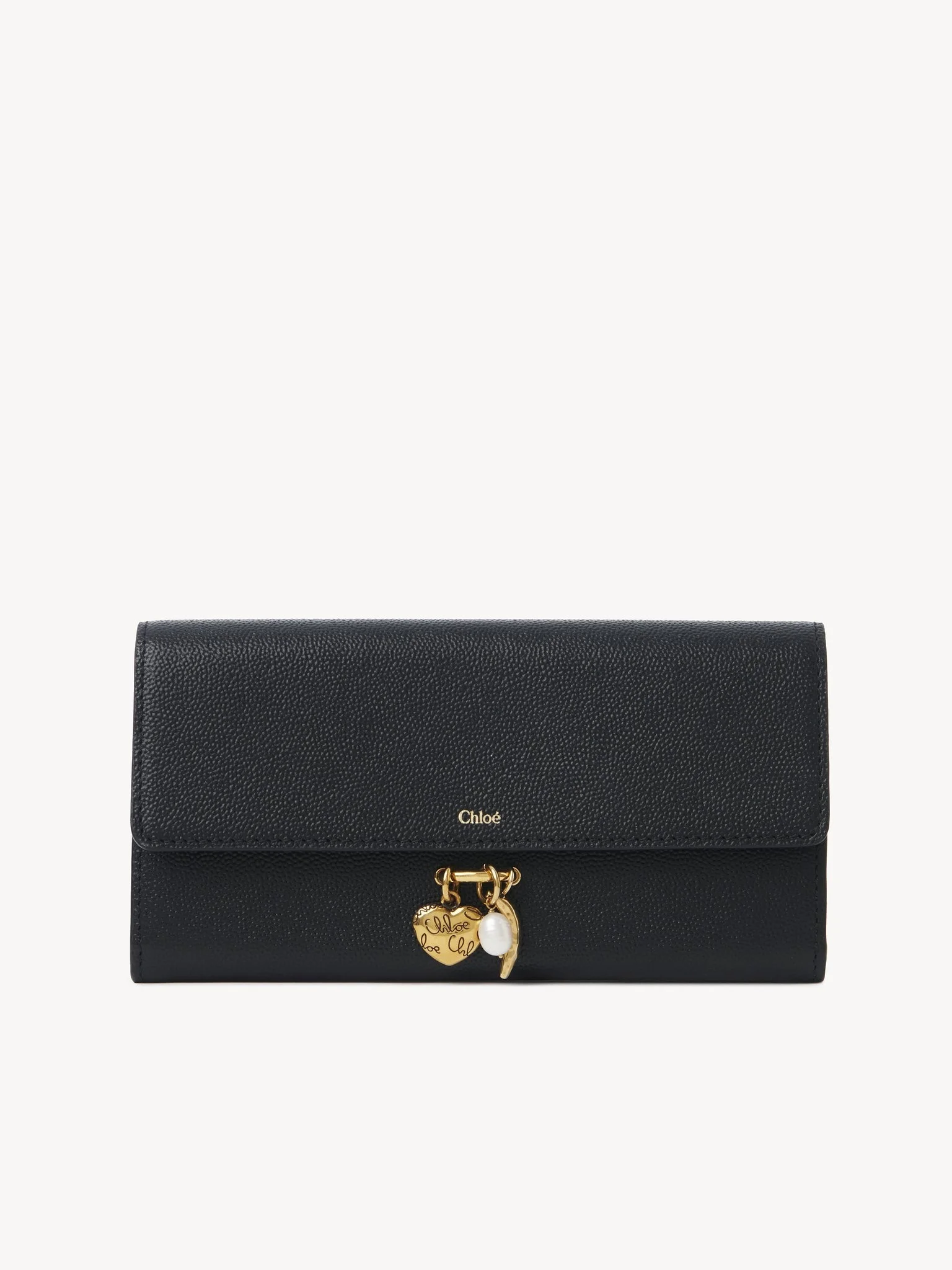 Crafted from shiny grained calfskin, this Chloe Charms long wallet with flap has two main compartments, two pockets and multiple card slots. The classic silhouette is embellished with the Chloe logo, while pearl, heart and banana charms nod to the Maison's heritage. PRODUCT DETAILS Long wallet with flap in shiny grained calfskin Main lining: Lambskin Flap lining: Calfskin Inside trim: 65% Polyester, 35% Cotton - 2 main compartments - 1 flat pocket - 12 card slots - 1 zipped outer pocket - Snap button closure Comes with a dust bag - Width: 7.9" (20 cm) - Height: 4.7" (12 cm) - Depth: 1.2" (3 cm) To make this product, Chloe worked with Leather Working Group (LWG) certified leather manufacturers. LWG certifies tanneries based on their water and energy usage, management of chemicals, solid waste, and wastewater. Color: Black Item code: CH25AP987Q12001