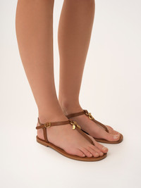 DESCRIPTION Crafted from shiny calfskin, the Chloe Charms flat sandals pair a delicate thong upper with an adjustable buckled ankle strap. The front is embellished with subtle gold-tone charms inspired by the Maison's heritage. PRODUCT DETAILS Flat sandal Upper: calfskin Inner sole: calfskin Main lining: calfskin Sole: cowhide Fit true to size, European sizing - Buckle fastening To make this product, Chloe worked with Leather Working Group (LWG) certified leather manufacturers. LWG certifies tanneries based on their water and energy usage, management of chemicals, solid waste, and wastewater. Color: Ginger Brown Item code: CHC25A12SLT27T CARE INSTRUCTIONS Your Chloe shoes have been carefully crafted by master artisans. The leather was selected with great care for its natural beauty and its finishes provide long-lasting wear.To preserve their beauty and original appearance, we recommend that you take special care of your Chloe shoes.Store them away from direct sunlight, heat and rain. To prevent colour migration avoid any contact with other leathers.Should your shoes get wet, dry them with a soft cloth. The smooth or grained leather parts of your shoes can be cleaned with a dry, soft cloth.To maintain the velvety appearance of suede or nubuck leather, gently clean with a crepe brush.Fill your shoes with tissue paper to help them maintain their original shape, then place them in the two protective covers provided. Store them in a cool, dry, well-aired place. TRACEABILITY Better traceability is central to improving our materials as well as social and environmental practices. Assembly: Spain Stitching: Spain Finishing: Spain