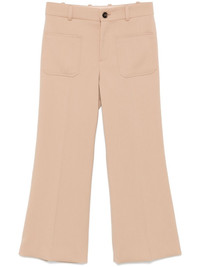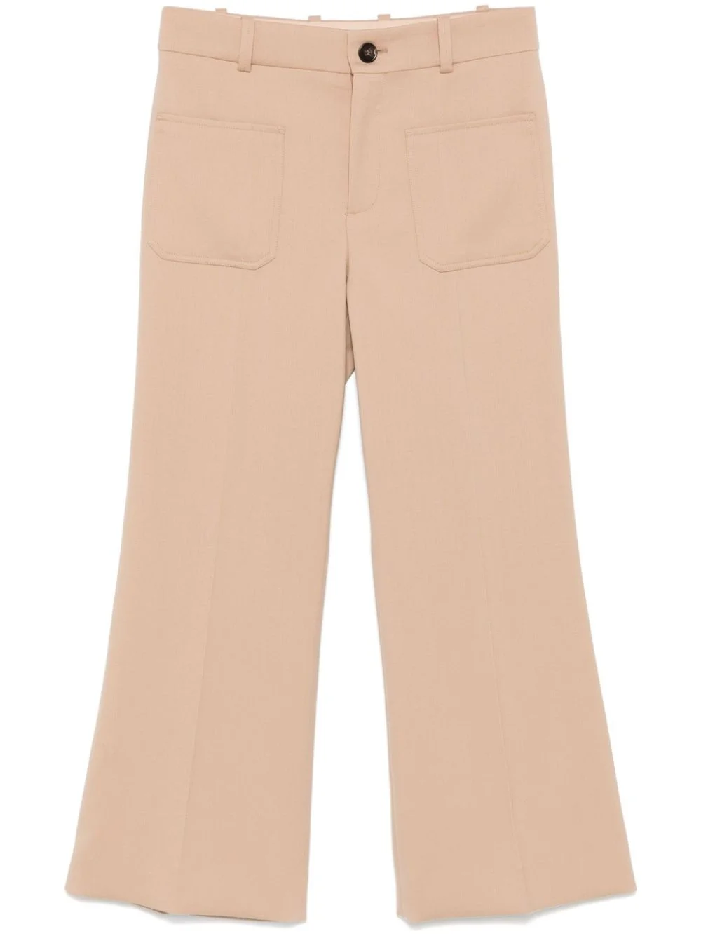 cropped trousers Highlights - Sand brown - Wool - Twill weave - Cropped leg - Front button and zip fastening - Low-rise - Belt loops - Pressed crease - Two front patch pockets Made in France Composition Outer: Wool 100%, Buffalo Horn 100% Lining: Viscose 51%, Cotton 49% SIZE & FIT Model measurements Height 5 ft 11 in(1.8 m) Bust/Chest 32.67 in(83 cm) Hips 35.03 in(89 cm) Waist 25.19 in(64 cm) FittingInformation Designed with a flared hem, these trousers allow for a close fit at the waist with a slim fit over the leg and widening towards the hem Cropped in length Made from a midweight non-stretch fabric