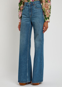Info & Care Chloe;denim jeans High-rise fit, flared-leg cut, belt loops, five pockets, designer plaque, whiskered, faded finish Partially concealed button and zip fastening at front 100% cotton Machine wash cold inside out to avoid colour transfer Size & Fit Front rise: 11 inches/;28cm Inside leg length: 34 inches/ 86.5cm Midweight Model is 5'9"/ 175cm and wears a size W27