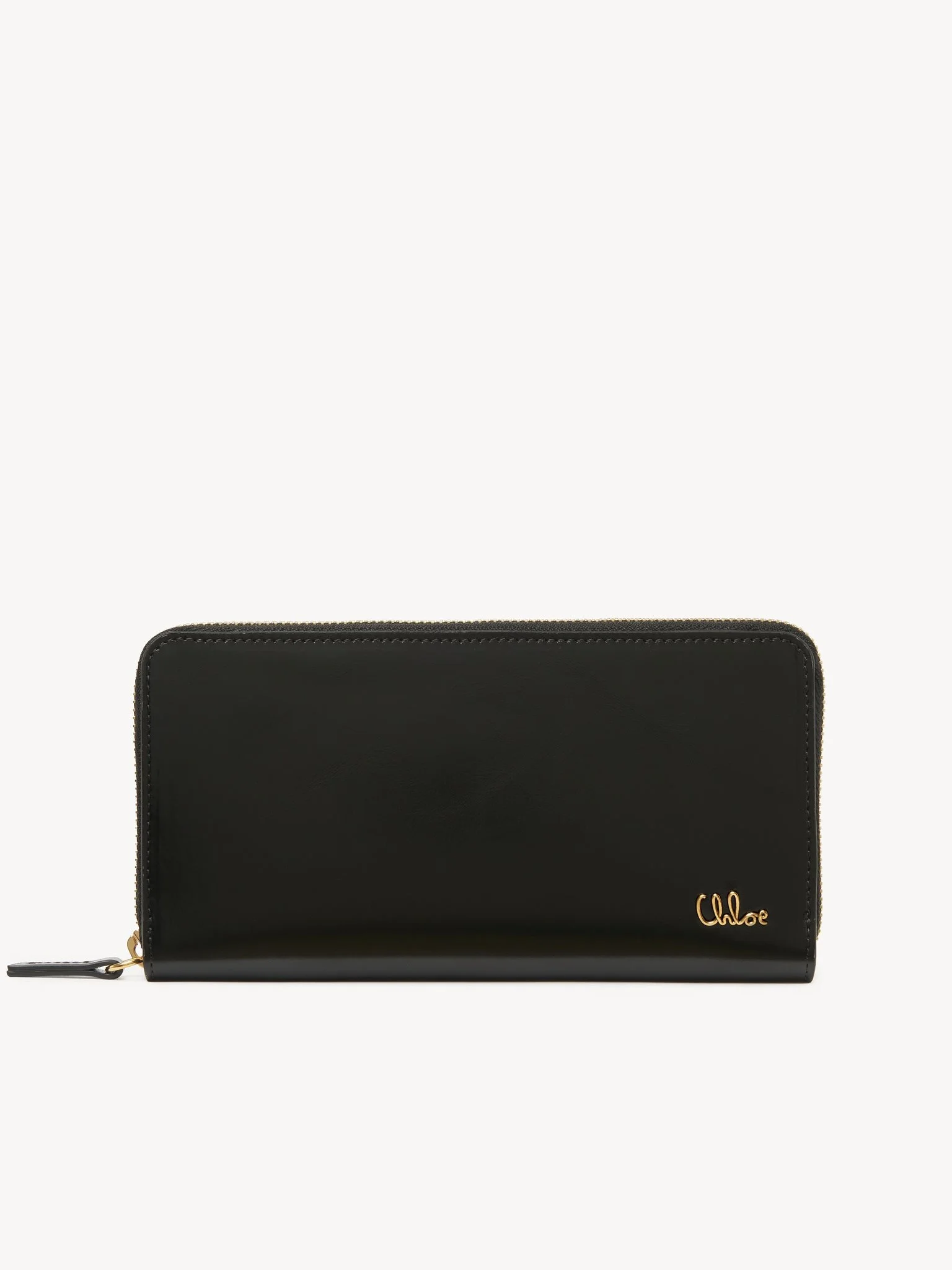 Crafted from shiny calfskin, the Chloe Iconic zipped long wallet combines a minimalist design with a metallic signature from the Maison's archives. Sized to fit the essentials, this practical accessory features a roomy main compartment, multiple card slots and a zipped inside pocket. PRODUCT DETAILS Zipped long wallet in shiny calfskin Main lining: Calfskin Inner lining: 65% Polyester, 35% Cotton - 1 main compartment - 1 zipped inside compartment - 8 card slots - 2 flat pockets - Zip closure Comes with a dust bag - Width: 7.9" (20 cm) - Height: 4.3" (11 cm) - Depth: 0.8" (2 cm) This long wallet is made from natural leather with a very light finish. Keep away from water (rain). The wallet may develop smooth or light halos. If the leather gets wet, dry it with a soft white cloth to absorb water. With use, the leather may become marked. To make this product, Chloe worked with Leather Working Group (LWG) certified leather manufacturers. LWG certifies tanneries based on their water and energy usage, management of chemicals, solid waste, and wastewater. Color: Black Item code: CH25SP488O16001
