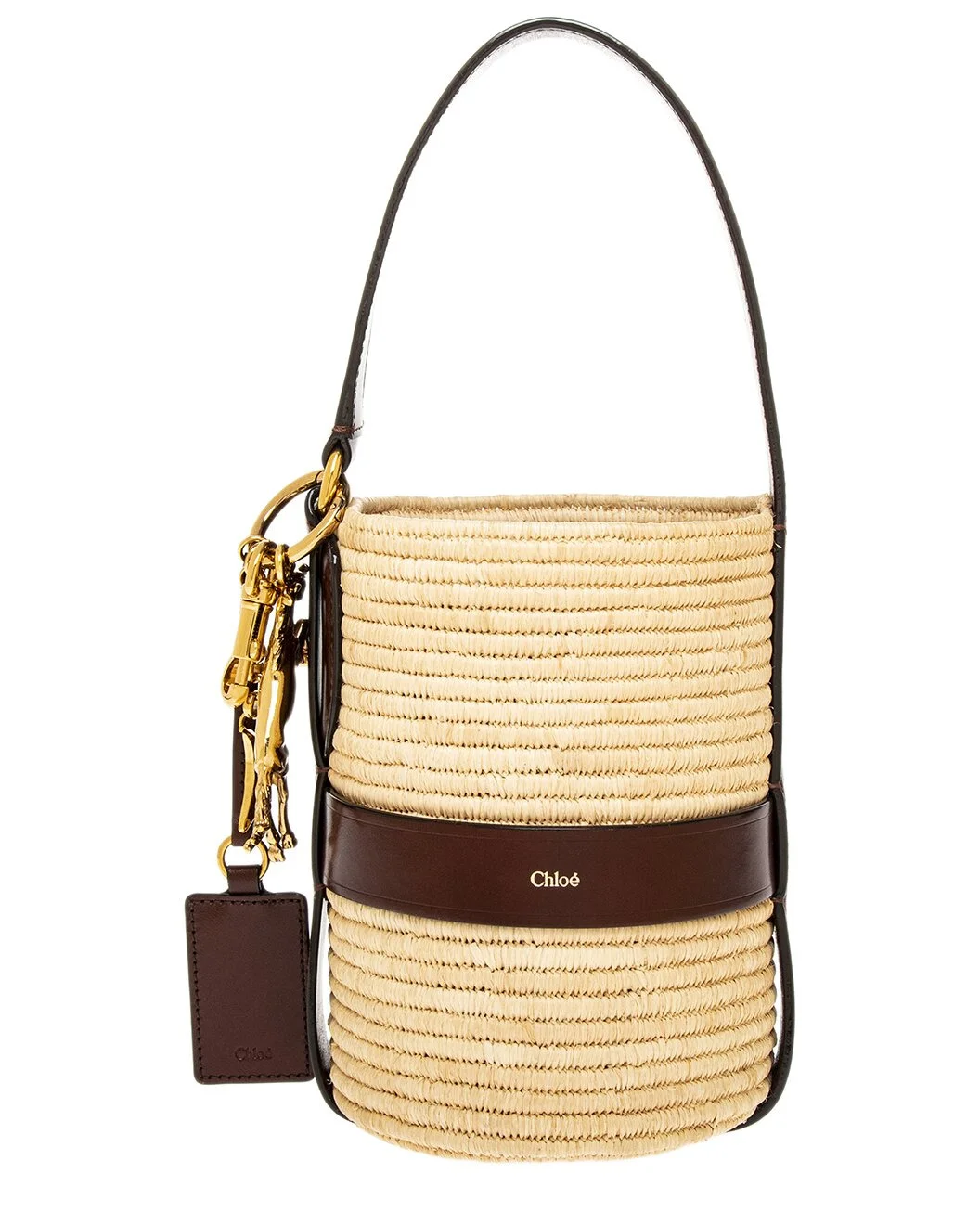 - About the brand: Romantic, cool, and glamorous. - Made in Italy - Color/material: natural/ebony raffia fabric, canvas and leather - Design details: gold-tone hardware, cylindrical shaped bag in a raffia-effect material that features brown leather trim and straps and a gold-toned horse and clip charms, can be worn on the shoulder with adjustable shoulder strap, Comes with a canvas interior lining and drawstring closure - Interior design details: decorative leather drawstrings, canvas lining, one compartment - Measures 5.5in wide x 7.9in high x 5.1in deep - Top handle drops 6.3in - Drawstring closure - Please note: All measurements were taken by hand and are approximate; slight variations may occur. - Our products are 100% genuine. In some cases we purchase merchandise from trusted independent suppliers and not directly from the brand owner. In all cases we stand by the authenticity of every product sold on our site.