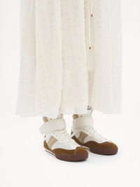 Inspired by the ballet and boxing worlds, these Chloe Kick high-top sneakers are crafted from recycled mesh and smooth suede calfskin. The slim silhouette pairs an almond toe with a high ankle secured by a wide leather strap debossed with the Chloe logo. Lightweight and comfortable, these hybrid sneakers combine a recycled sole with an inner wedge for added height and support. A boxing-style Chloe label lends a signature finish. PRODUCT DETAILS High-top sneaker heel height: 0.8" (2 cm) Heel-to-toe drop: 0.2" (0.5 cm) Upper 1: calfskin Upper 2: cowhide Upper 3: suede cowhide Upper 4: polyester Upper 5: nylon Inner sole: polyester Main lining: polyester Sole: 50% ethylene vinyl acetate, 50% rubber Fit true to size, European sizing - Lace-up - Adjustable strap Chloe Kick sneakers come in a dedicated dustbag and box evoking the ballet and boxing worlds. To make this product, Chloe worked with Leather Working Group (LWG) certified leather manufacturers. LWG certifies tanneries based on their water and energy usage, management of chemicals, solid waste, and wastewater. Color: Natural Brown Item code: CHC25S07HPL243