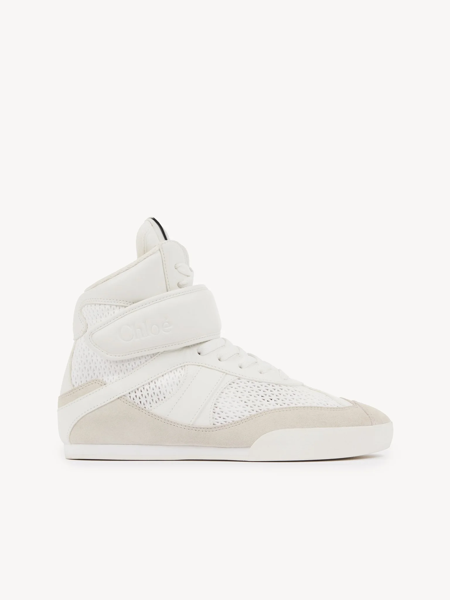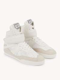 Inspired by the ballet and boxing worlds, these Chloe Kick high-top sneakers are crafted from recycled mesh and smooth suede calfskin. The slim silhouette pairs an almond toe with a high ankle secured by a wide leather strap debossed with the Chloe logo. Lightweight and comfortable, these hybrid sneakers combine a recycled sole with an inner wedge for added height and support. A boxing-style Chloe label lends a signature finish. PRODUCT DETAILS High-top sneaker heel height: 0.8" (2 cm) Heel-to-toe drop: 0.2" (0.5 cm) Upper 1: calfskin Upper 2: cowhide Upper 3: suede cowhide Upper 4: polyester Upper 5: nylon Inner sole: polyester Main lining: polyester Sole: 50% ethylene vinyl acetate, 50% rubber Fit true to size, European sizing - Lace-up - Adjustable strap Chloe Kick sneakers come in a dedicated dustbag and box evoking the ballet and boxing worlds. To make this product, Chloe worked with Leather Working Group (LWG) certified leather manufacturers. LWG certifies tanneries based on their water and energy usage, management of chemicals, solid waste, and wastewater. Color: Cloudy Cream Item code: CHC25S07HPL20S