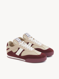 Inspired by the ballet and boxing worlds, these Chloe Kick sneakers are crafted from recycled active mesh and a mix of smooth and suede cowhide with an updated design, featuring a lighter silhouette and a debossed Chloe logo at the side and back. These comfortable sneakers combine a recycled sole with an inner wedge for added height and support. A boxing-style Chloe label lends a signature finish. PRODUCT DETAILS Sneaker heel height: 0.8" (2 cm) Heel-to-toe drop: 0.2" (0.5 cm) Upper: 60% cowhide, 40% polyester Inner sole: polyester Main lining: polyester Sole: 50% ethylene vinyl acetate, 50% rubber Fit true to size, European sizing - Lace-up Chloe Kick sneakers come in a dedicated dustbag and box evoking the ballet and boxing worlds. To make this product, Chloe worked with Leather Working Group (LWG) certified leather manufacturers. LWG certifies tanneries based on their water and energy usage, management of chemicals, solid waste, and wastewater. Color: Beige - Purple Item code: CH25W07IVD95U