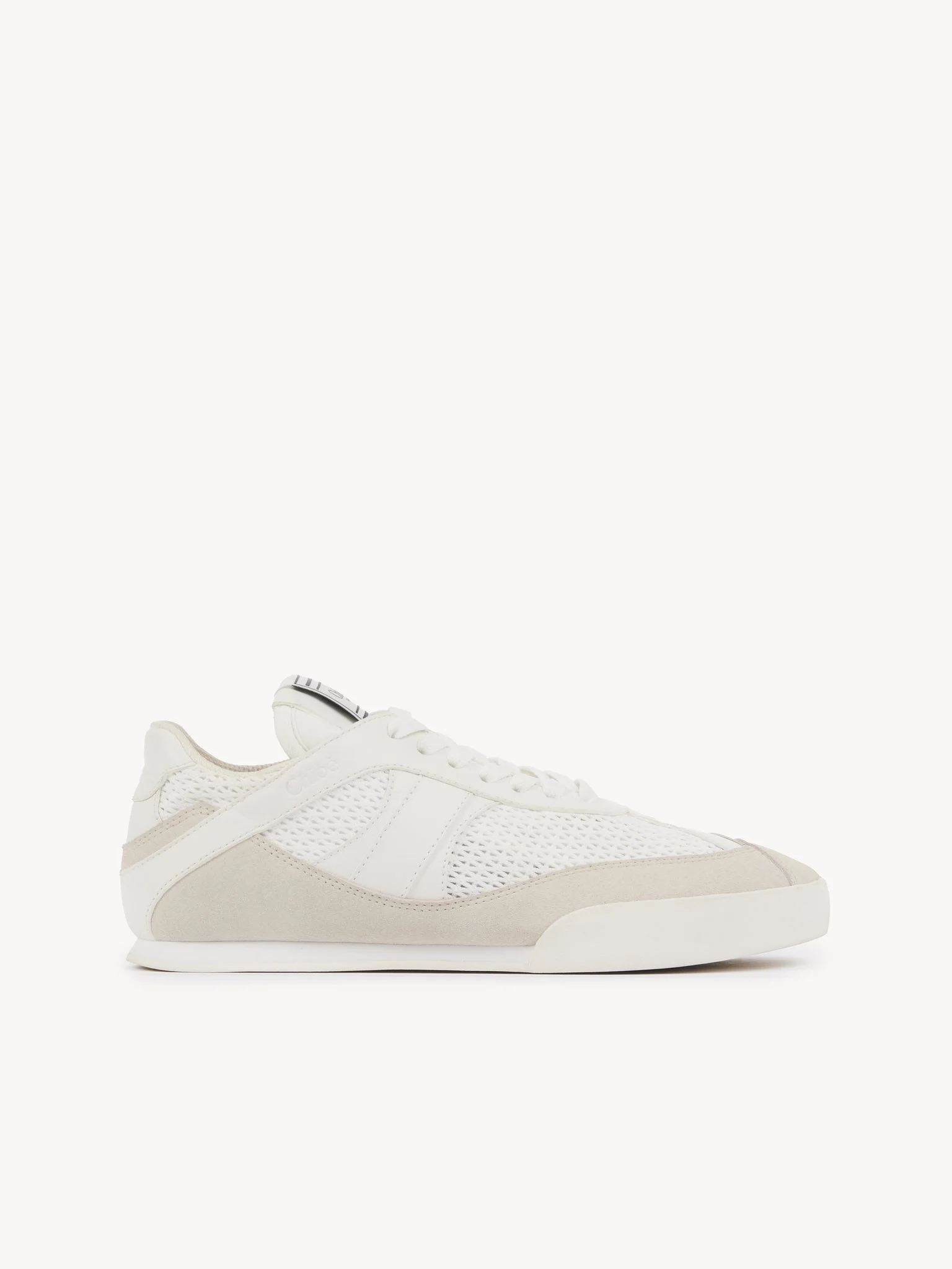 Inspired by the ballet and boxing worlds, these Chloe Kick sneakers are crafted from recycled mesh and smooth suede calfskin. Lightweight and comfortable, they combine a slim silhouette with a recycled sole and an inner wedge for added height and support. A boxing-style Chloe label lends a signature finish. PRODUCT DETAILS Sneaker heel height: 0.8" (2 cm) Heel-to-toe drop: 0.2" (0.5 cm) Upper 1: calfskin Upper 2: cowhide Upper 3: suede cowhide Upper 4: polyester Upper 5: nylon Inner sole: polyester Main lining: polyester Sole: 50% ethylene vinyl acetate, 50% rubber Fit true to size, European sizing - Lace-up Chloe Kick sneakers come in a dedicated dustbag and box evoking the ballet and boxing worlds. To make this product, Chloe worked with Leather Working Group (LWG) certified leather manufacturers. LWG certifies tanneries based on their water and energy usage, management of chemicals, solid waste, and wastewater. Color: Cloudy Cream Item code: CHC25S07IPL20S