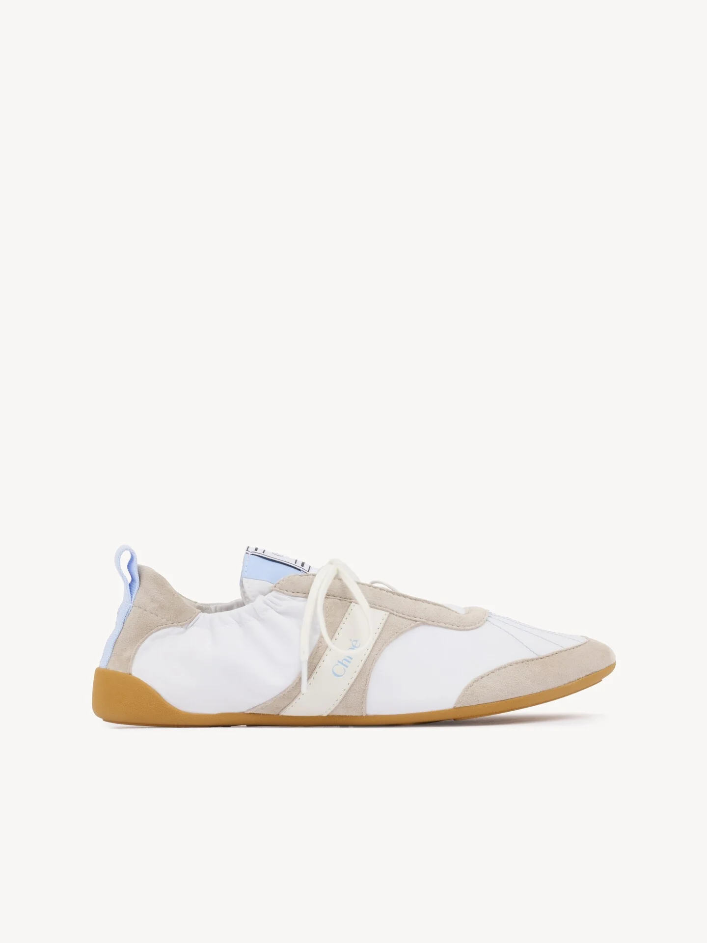 DESCRIPTION Inspired by the ballet and boxing worlds, these Chloe Kick sneakers are crafted from nylon and suede in an ultra-light silhouette with a flexible recycled rubber sole for a second-skin effect. The Chloe logo signs the side and the back loop, while a boxing-style Chloe label finishes the tongue of these comfortable ballet sneakers. PRODUCT DETAILS Flat sneaker Upper 1: nylon Upper 2: TPU Upper 3: goatskin Upper 4: sheepskin Inner sole: cowhide Main lining: nylon Secondary lining: 80% polyester, 20% polyurethane Sole: rubber Fit true to size, European sizing - Lace-up Chloe Kick sneakers come in a dedicated dustbag and box evoking the ballet and boxing worlds. To make this product, Chloe worked with Leather Working Group (LWG) certified leather manufacturers. LWG certifies tanneries based on their water and energy usage, management of chemicals, solid waste, and wastewater. Color: Dreamy Blue Item code: CH26S15RVL406 CARE INSTRUCTIONS Your Chloe sneakers have been carefully and exclusively crafted by a specialist. They combine sophisticated materials such as leather and/or suede/nubuck and/or lightweight fabrics for optimum comfort.To preserve their beauty and original appearance, we recommend that you take special care of your Chloe sneakers.Store them away from direct sunlight, heat and rain.To prevent colour migration avoid any contact with other leathers.If your sneakers get wet, remove the insole and leave to dry in a well-aired place.The smooth or grained leather parts of your sneakers can be cleaned with a dry, soft cloth.To maintain the velvety appearance of suede or nubuck leather, gently clean with a crepe brush.The fabric parts can be cleaned with a soft, slightlydamp cloth.Fill your sneakers with tissue paper to maintain the original shape, then place them in the two protective covers provided. Store them in a cool, dry, well-aired place.