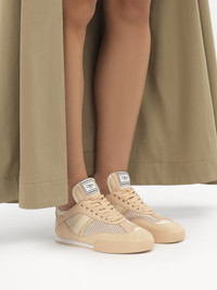Inspired by the ballet and boxing worlds, these Chloe Kick sneakers are crafted from recycled mesh and smooth suede calfskin. Lightweight and comfortable, they combine a slim silhouette with a recycled sole and an inner wedge for added height and support. A boxing-style Chloe label lends a signature finish. PRODUCT DETAILS Sneaker heel height: 0.8" (2 cm) Heel-to-toe drop: 0.2" (0.5 cm) Upper 1: calfskin Upper 2: cowhide Upper 3: suede cowhide Upper 4: polyester Upper 5: nylon Inner sole: polyester Main lining: polyester Sole: 50% ethylene vinyl acetate, 50% rubber Fit true to size, European sizing - Lace-up Chloe Kick sneakers come in a dedicated dustbag and box evoking the ballet and boxing worlds. To make this product, Chloe worked with Leather Working Group (LWG) certified leather manufacturers. LWG certifies tanneries based on their water and energy usage, management of chemicals, solid waste, and wastewater. Color: Peachy Pink Item code: CHC25S07IPL6J6