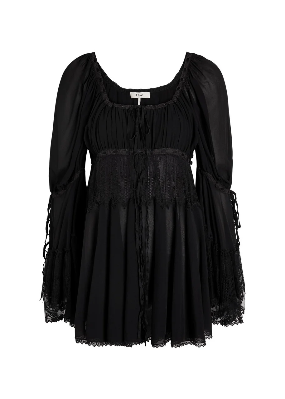 Info & Care Chloe semi-sheer silk-chiffon blouse Lace inserts, square-neck, drawstring-embellished raglan sleeves, flared cuffs with tiered detail,;tie-fastening keyhole at bust, adjustable drawstring under;bust, pleated details, scalloped lace trims, partially lined Concealed button-fastenings through front 100% silk Dry clean Size & Fit Length shoulder to hem: 31 inches/ 79cm Midweight Cut for loose fit,;use drawstring to cinch bust Model is 5'9"/ 175cm and wears a size;FR36