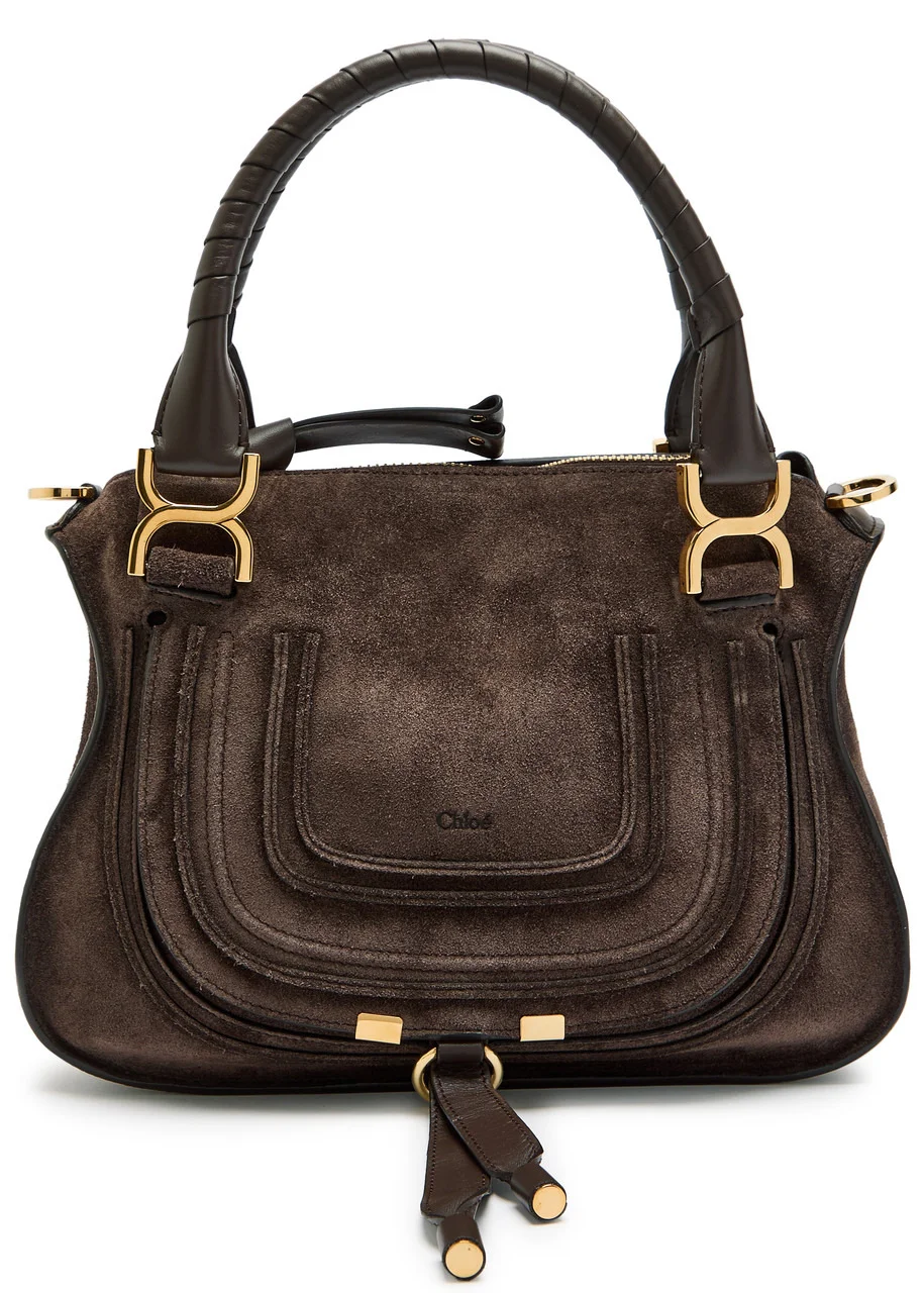 Info & Care Chloe;suede shoulder bag; Detachable adjustable leather shoulder strap, two twisted leather top handles, debossed logo, appliqued panels at front flap, concealed front slip pocket, internal zip-fastening pocket, fully lined Ring fastening at flap front; Size & Fit Width: 12 inches/ 30.5cm; Height: 9 inches/ 23cm Depth: 3.5 inches/ 9cm; Top handle drop: 6 inches/ 15cm; Min. shoulder strap drop: 18 inches/ 46cm; Max. shoulder strap drop: 20 inches/ 51cm;