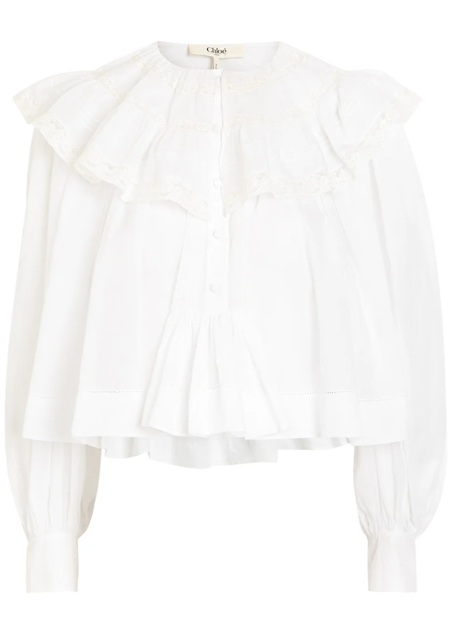 Info & Care Chloe cotton blouse; Ruffled overlay, button-fastening neck, rounded sleeves, button-fastening cuffs, lace trims, ;jour echelle inserts, pintuck and gathered details Slips on 100% cotton Dry clean Size & Fit Length shoulder to hem: 18 inches/ 46cm Midweight Loose fit, flared style Cropped Model is 5'10"/ 178cm and wears a size;FR36