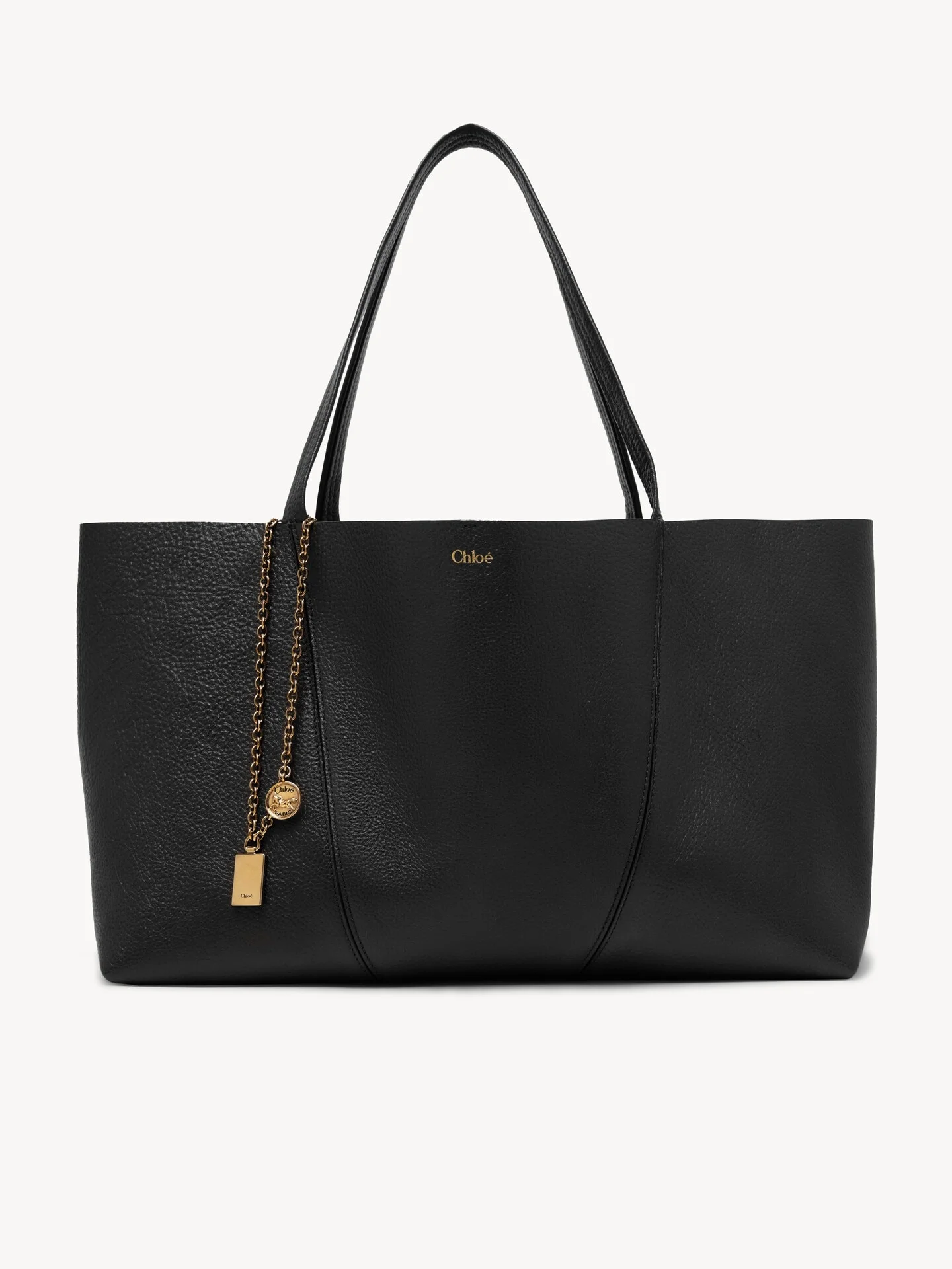 DESCRIPTION Crafted from shiny grained calfskin, this Chloe Spin east-west tote bag features a roomy compartment elevated with graphic lines. A dangling chain features the Maison's signature Chloe and Horse Medals. Wear on the shoulder or slide the handles through the ring for hand carry. PRODUCT DETAILS Chloe Spin east-west tote bag in shiny grained calfskin Main material: Calfskin Carry: Shoulder & hand - 1 main compartment Comes with a dust bag - Width: 15.4" (39 cm) - Height: 9.4" (24 cm) - Depth: 8.3" (21 cm) - Handle drop: 8.7" (22 cm) To make this product, Chloe worked with Leather Working Group (LWG) certified leather manufacturers. LWG certifies tanneries based on their water and energy usage, management of chemicals, solid waste, and wastewater. This Chloe Spin bag is made with unlined leather, so there may be slight marks inside the bag, such as veins or scratches. Color: Black Item code: CH26SS814N84001 CARE INSTRUCTIONS In order to protect this article, we recommend that you: avoid overloading your bag avoid rubbing against abrasive materials shield it from humidity, light and heat avoid contact with liquids and greasy substances (makeup, cream) store your bag carefully in its dustcover when not in use avoid rubbing against color-contrasting clothes or materials to remove a water stain, gently soak up liquid by dabbing it with a white cloth should a scratch occur on the leather, you can gently massage it with the same type of cloth for all other issues, please contact the Chloe after-sales service or a specialist. TRACEABILITY Better traceability is central to improving our materials as well as social and environmental practices. Dyeing: Italy Finishing: Italy Tanning: Italy