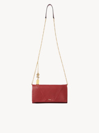 Crafted from grained buffalo leather, the Chloe Spin flap wallet has a minimalist silhouette elevated with graphic lines. A dangling chain features the Maison's signature Chloe and Snake Medals for a radiant finish. Sized to fit your phone, this wallet on chain comes with a strap for shoulder and crossbody carry. PRODUCT DETAILS Flap wallet on chain in grained buffalo leather Main lining: Buffalo leather Inner lining: 65% Polyester, 35% Cotton Carry: Crossbody & shoulder - 1 chain strap - 1 flap with magnetic closure - 2 main compartments - 1 zipped compartment - 6 card slots - 1 external flat pocket Comes with a dust bag - Width: 7.9" (20 cm) - Height: 3.9" (10 cm) - Depth: 1.6" (4 cm) This flap wallet is made from natural leather with a very light finish. Keep away from water (rain). The wallet may develop smooth or light halos. If the leather gets wet, dry it with a soft white cloth to absorb water. With use, the leather may become marked. To make this product, Chloe worked with Leather Working Group (LWG) certified leather manufacturers. LWG certifies tanneries based on their water and energy usage, management of chemicals, solid waste, and wastewater. Color: Red Flame Item code: CH25SP495O97636